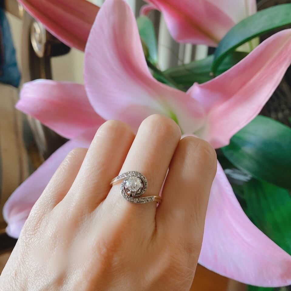中央のダイヤモンドはアンティークダイヤモンドらしい、ブリリアントカットのような表面上の煌めきとは違い、カット面のひとつひとつ に輝きが宿り、石全体がキラキラと柔らかく輝く印象があります。