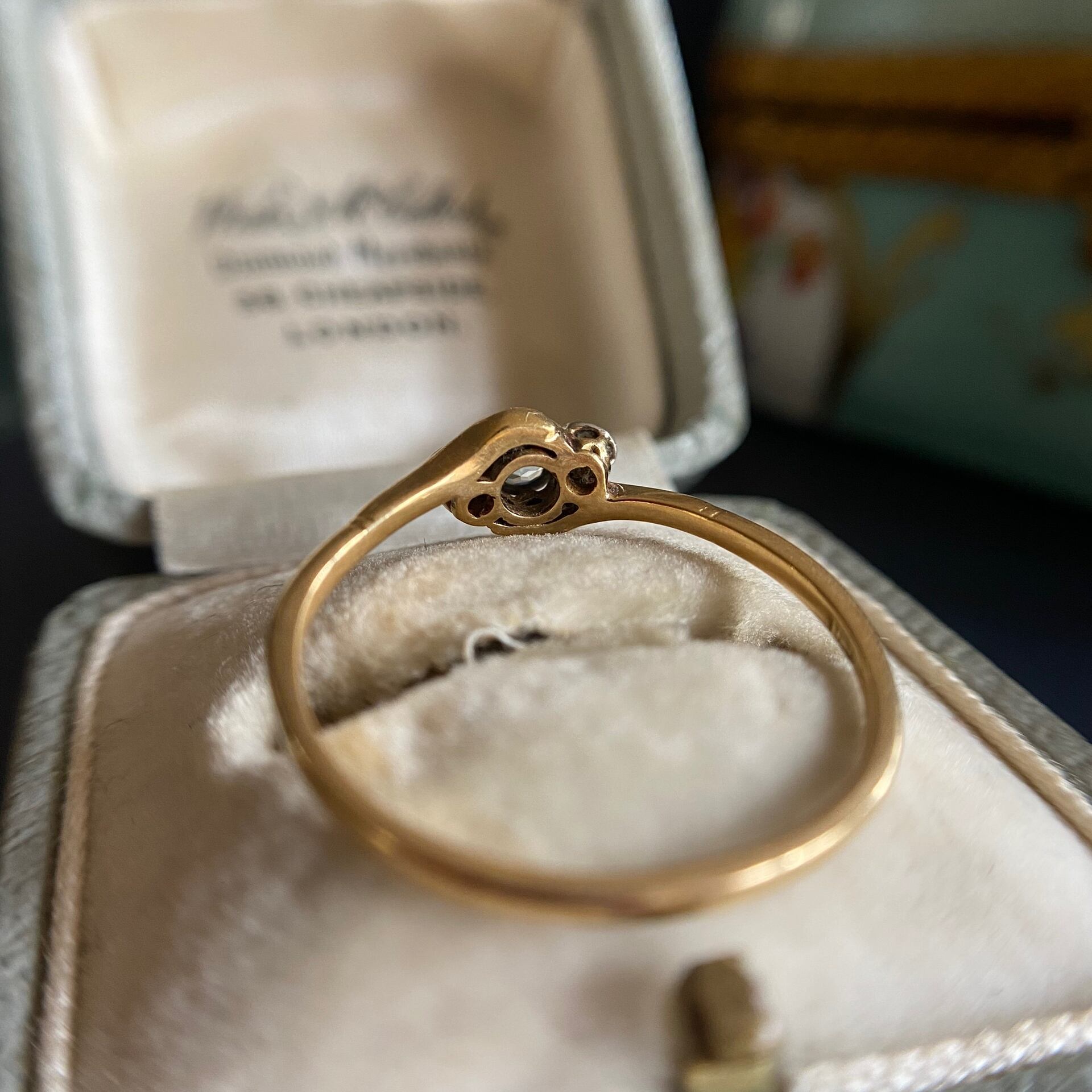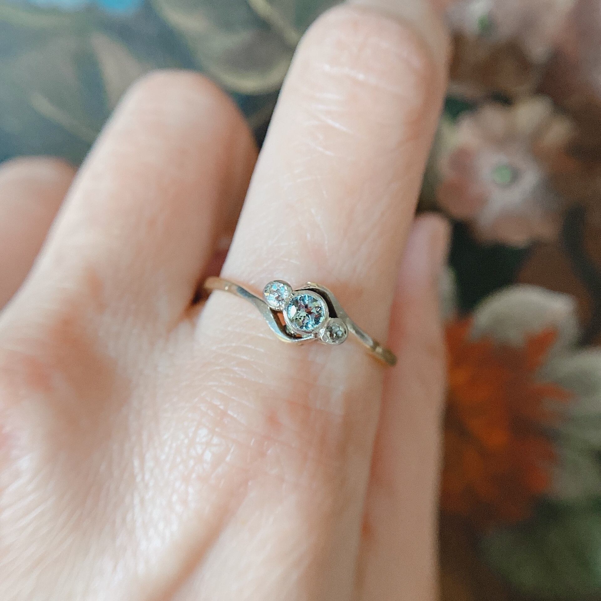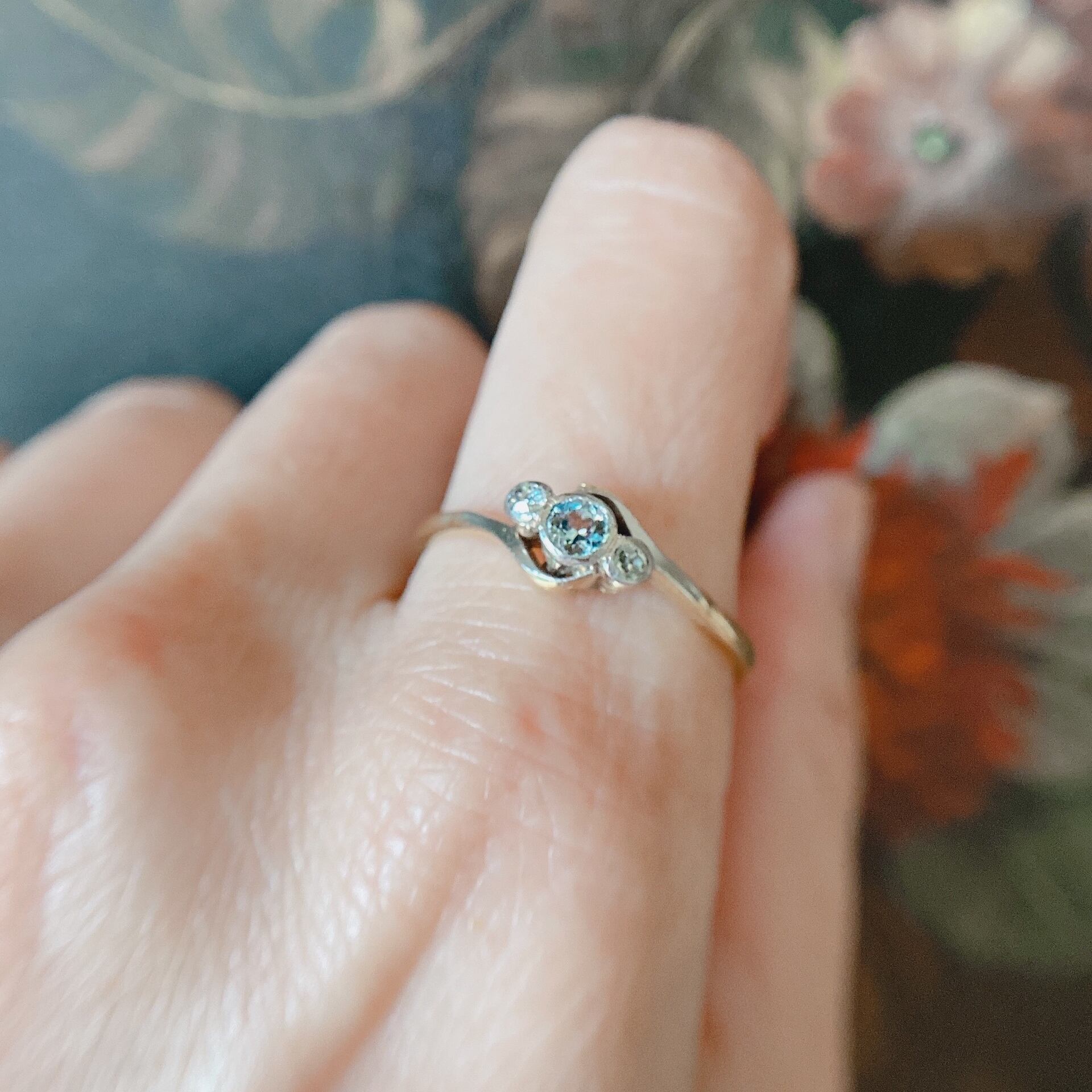 清らかに静寂に輝くエドワーディアンリング、爽やかで柔らかなブルー色に気持ちも安らぎ、小さいけど、アクアマリンだなんて実にレアで魅力が詰まった、優しく、手仕事のぬくもりを感じるひと品です。