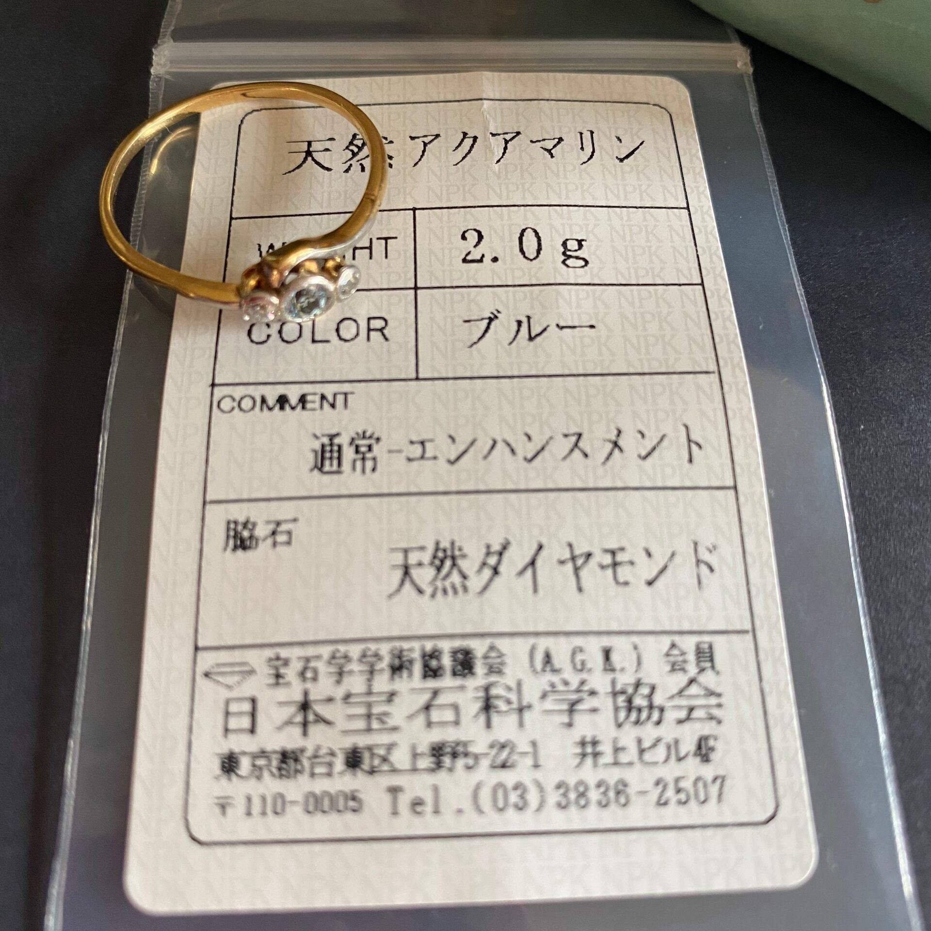 中央のアクアマリンは約3.2mm程、両脇の小さな小さなオールドカットダイヤモンドは約1.5mm程ですが、なんとなく他にはない特別感を感じるスリーストーンリングです。