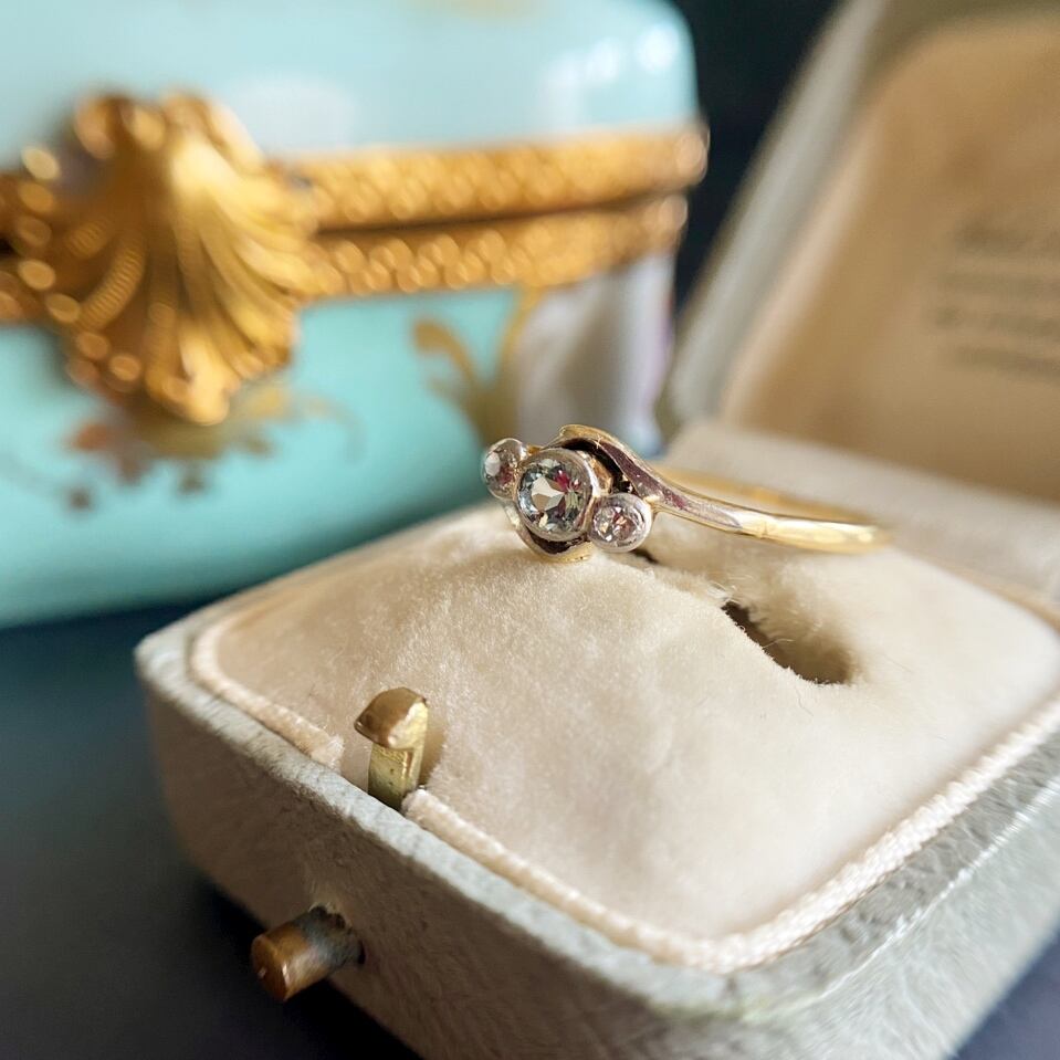 とてもスリムで柔らかなテクスチャーのゴールドのシャンク、そしてショルダー部分から台座にかけてはプラチナが使用され、それらに包まれるようにして並んだ3つの宝石達。