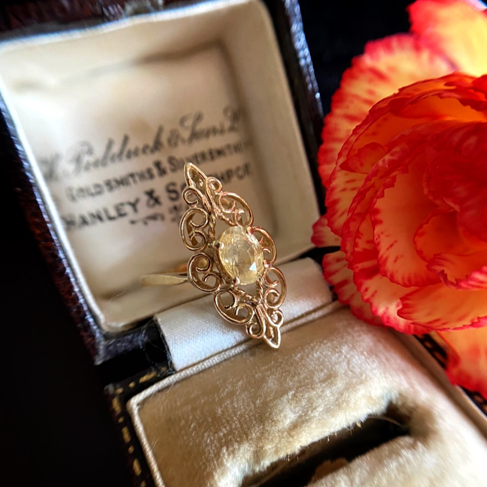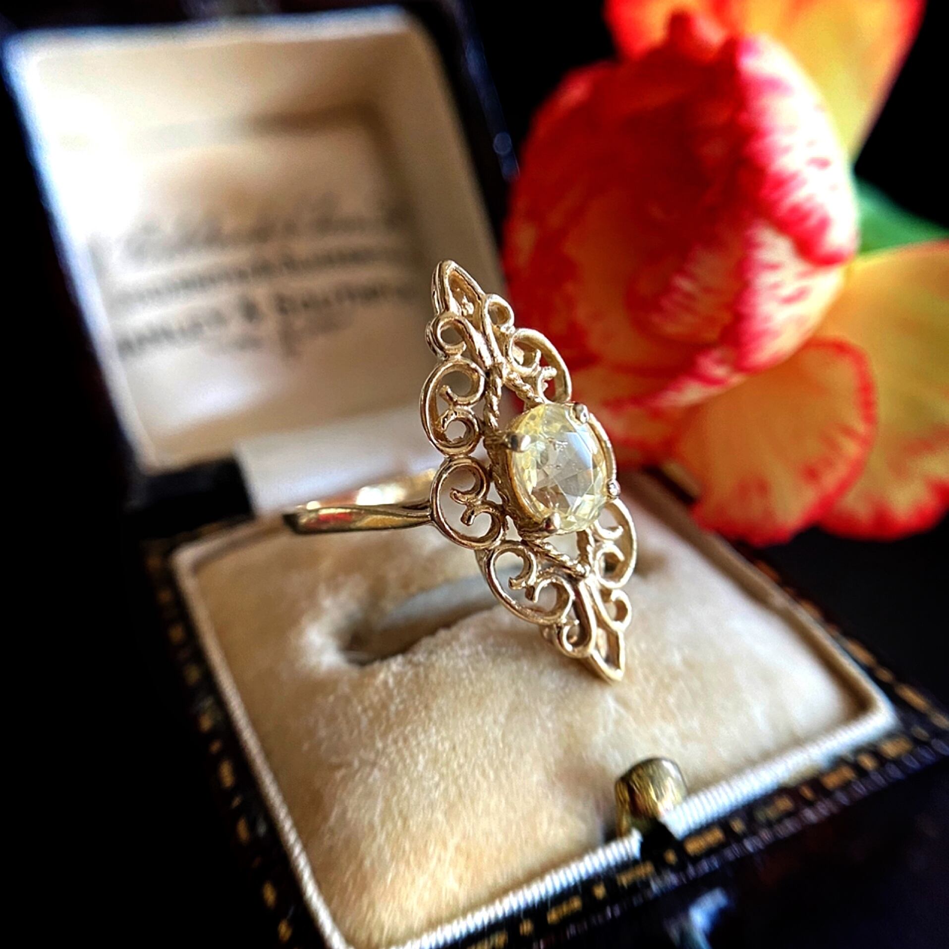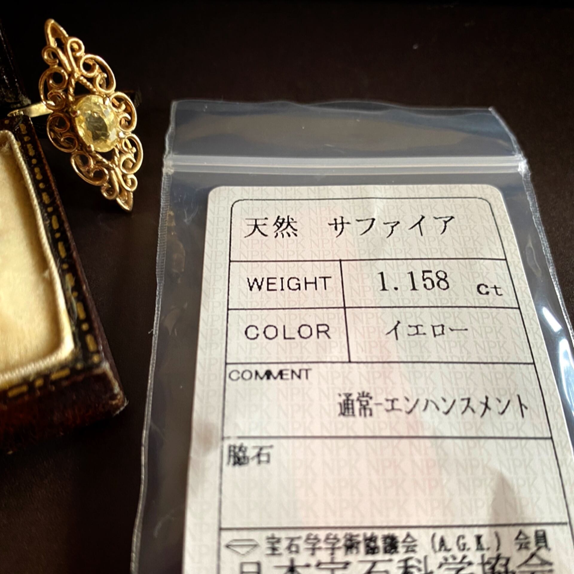 アラベスク模様の美しい透し彫りに同化するようにセットされた柔らかなレモンカラーのイエローサファイアリング。