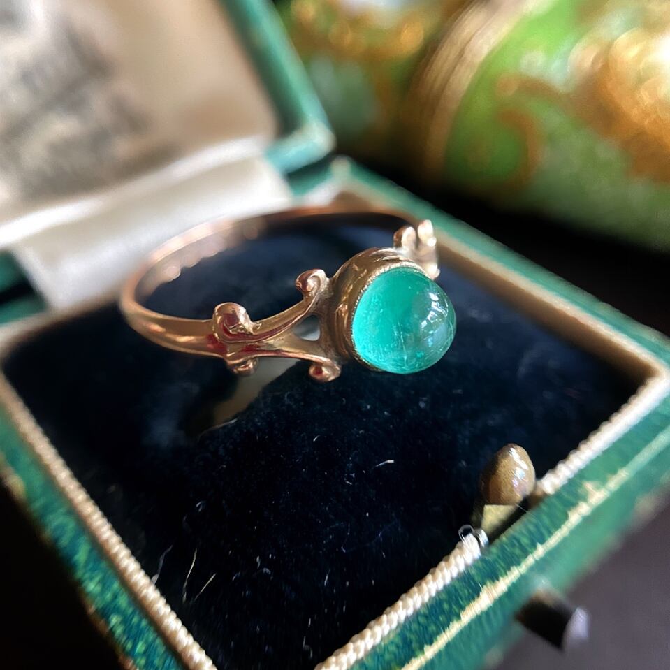 ゴールドのクルンとデザインが利いたスプリットシャンクの美しい輝きにはえるように、6mmのカボションカットエメラルドの若草色のように淡く薄い緑で、艶があり透明感のある石肌が潤ってみえて、つくづく素敵だと感じます。