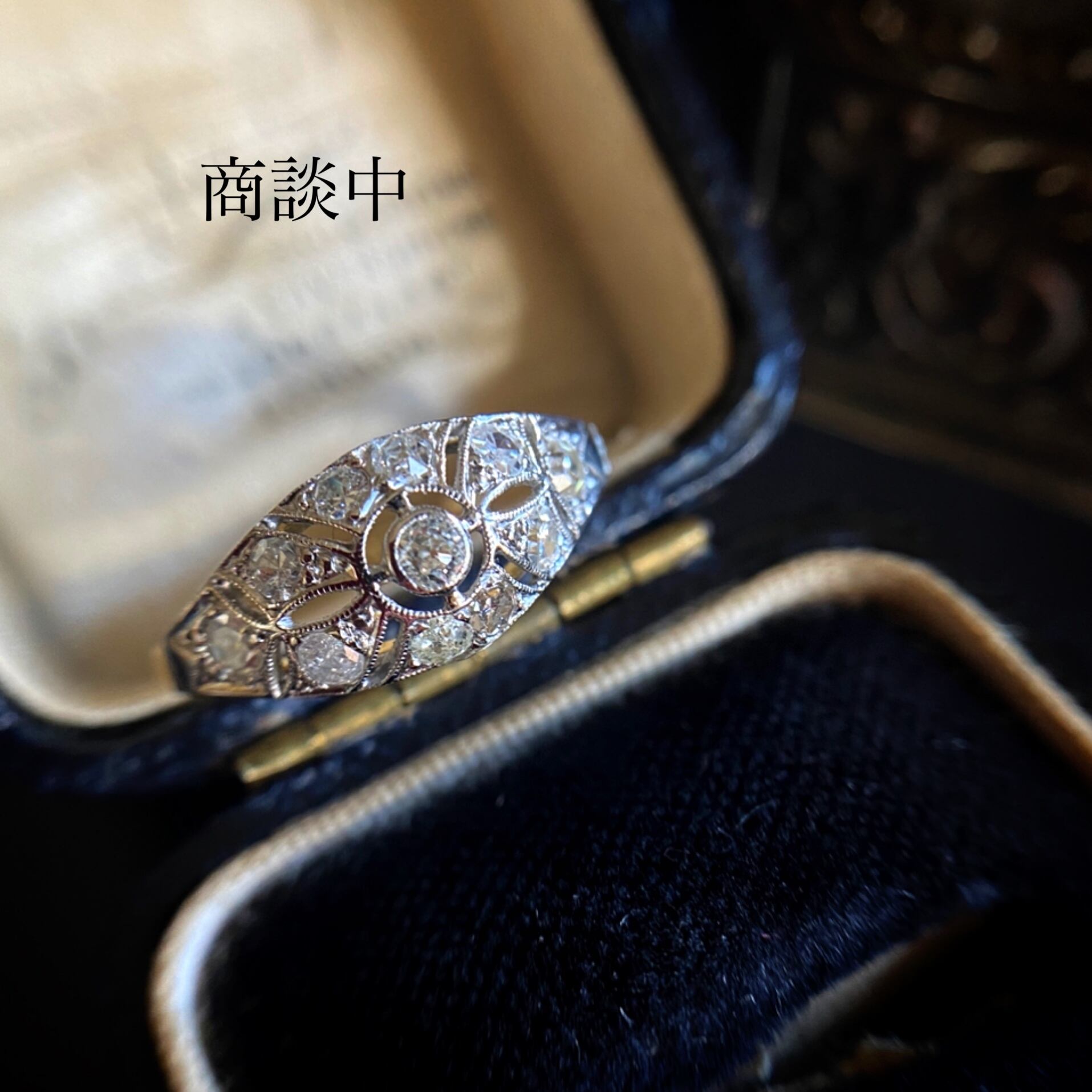 洗練されたエレガントなジュエリーが多く作られたエドワーディアンらしいこちらのリングの中央にはオールドヨーロピアンカットダイヤモンドが、その周りには10石のシングルカットダイヤモンドがセットされ、左右対称の端正なデザインの中で小さなダイヤモンドであっても透明感のある美しいアンティークダイヤモンドは、プラチナ部分に施された細かなミルグレインの光に反射し、共鳴し、華やかさがますひと品です。