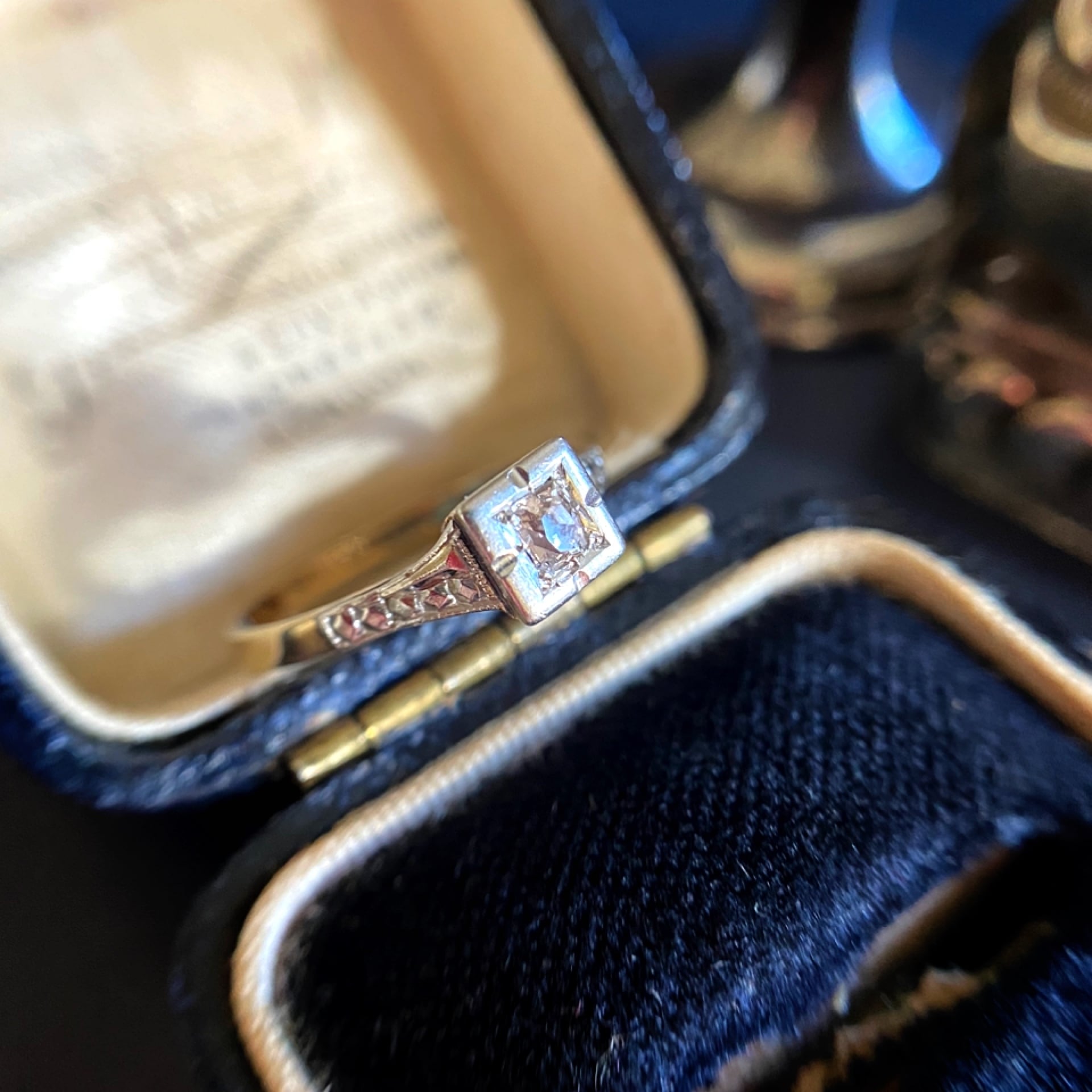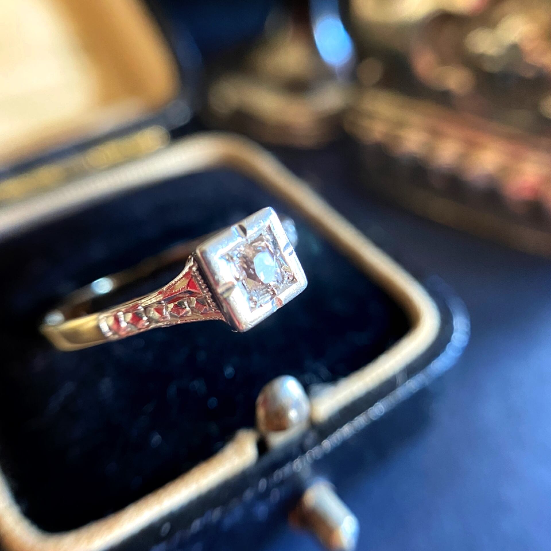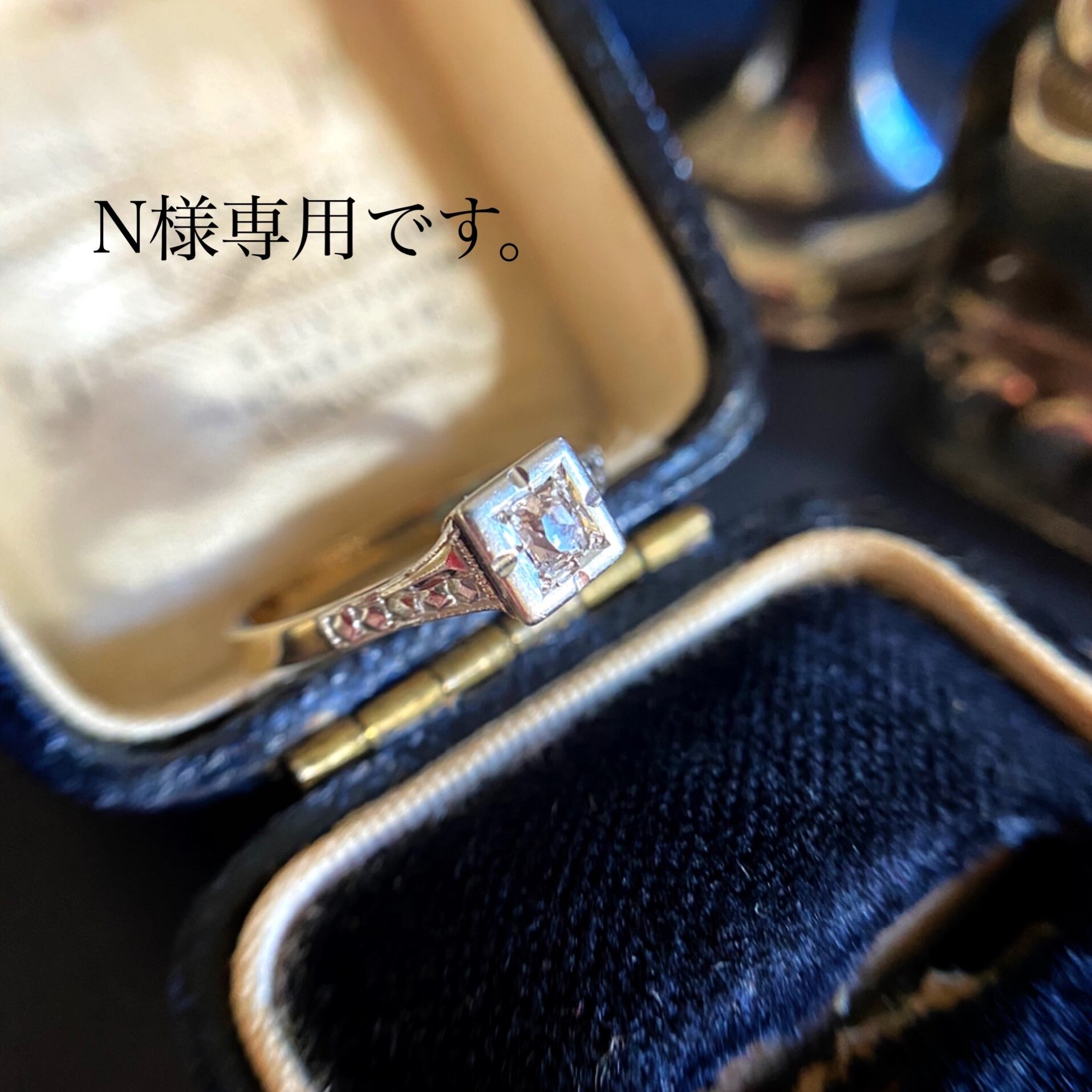 高くあげられたプラチナの四角い台座の中にすっぽりとひとかけらの星のようなオールドマインカットダイヤモンドを大事にセットしたリングはハンドメイドのぬくもりが過ごしたぶんだけの味わいとなり、どこかノスタルジーなひと品です。