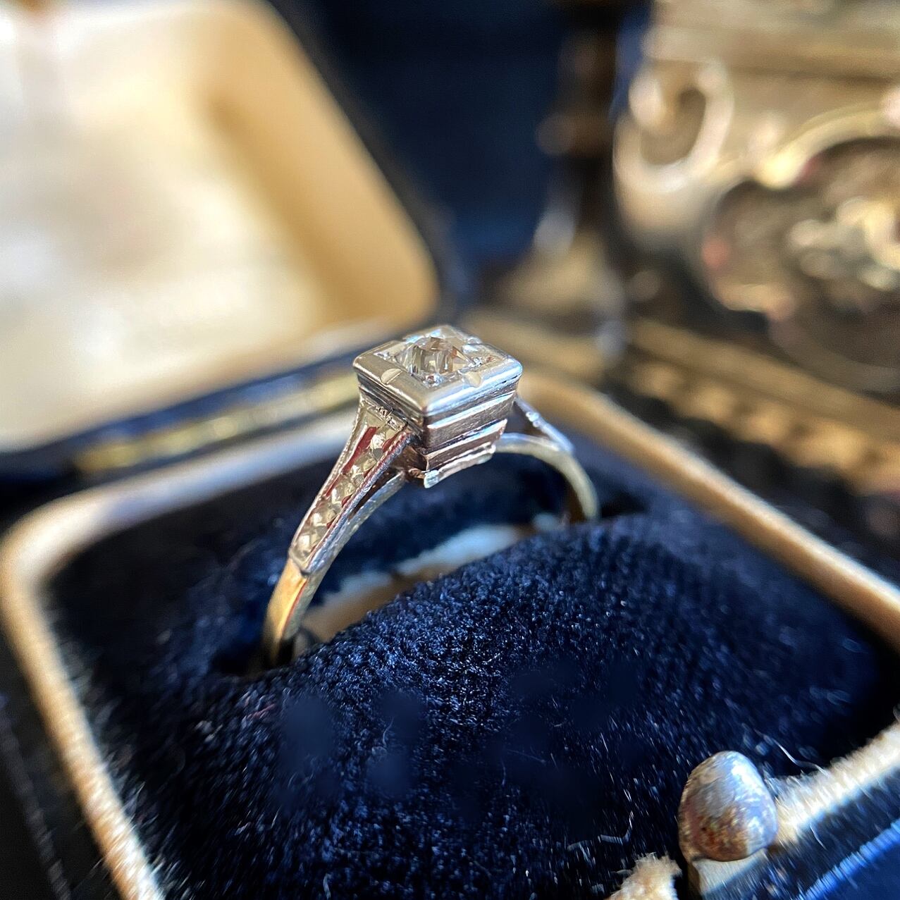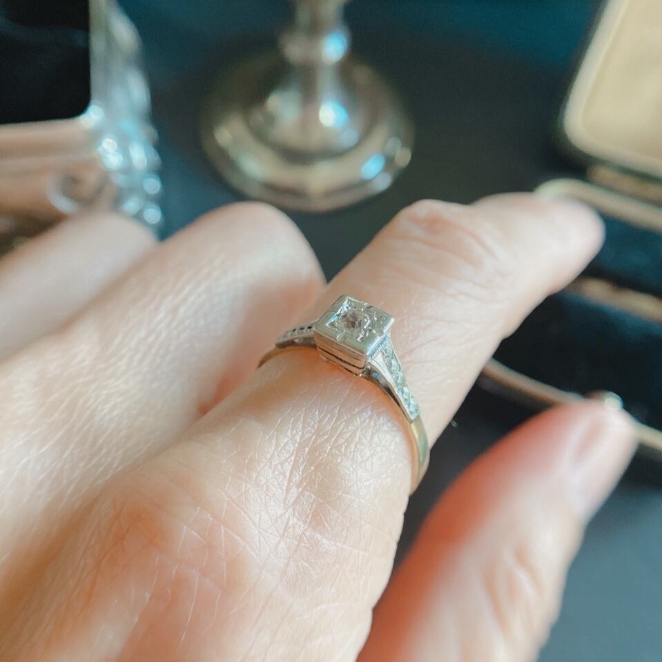 アールデコらしいちょっと男性的でカクカクとすっきりしたモダンなデザインの中で小さなダイヤモンドの氷のようなクールに煌めきがかっこいいリングです。