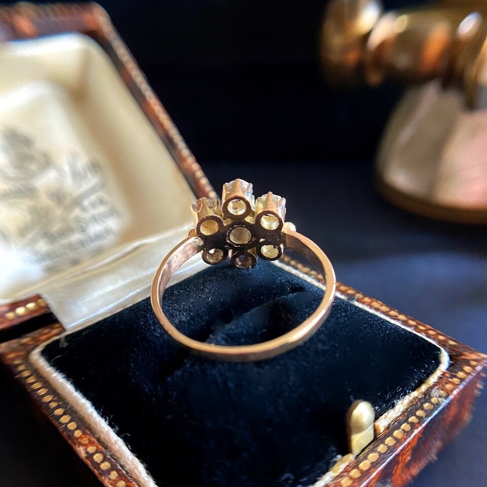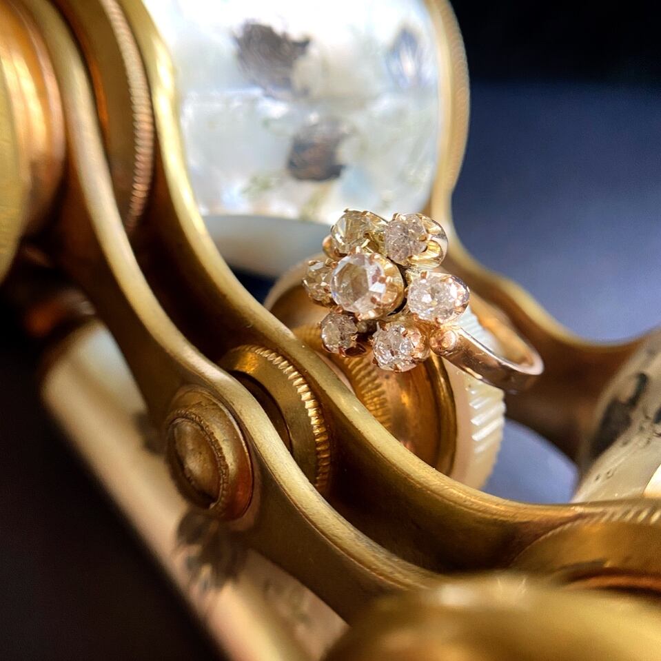 粒の型や色味がそれぞれちょっぴり違うけれど、ローズカットダイヤモンドを花芯にして、花びらにはオールドマインカットダイヤモンドを飾って華やかなデイジーが花を咲かせた、普遍的な可愛らしいお花のリングを可愛すぎず、クールに仕立てた大人の為のクラスターリングのご紹介です。