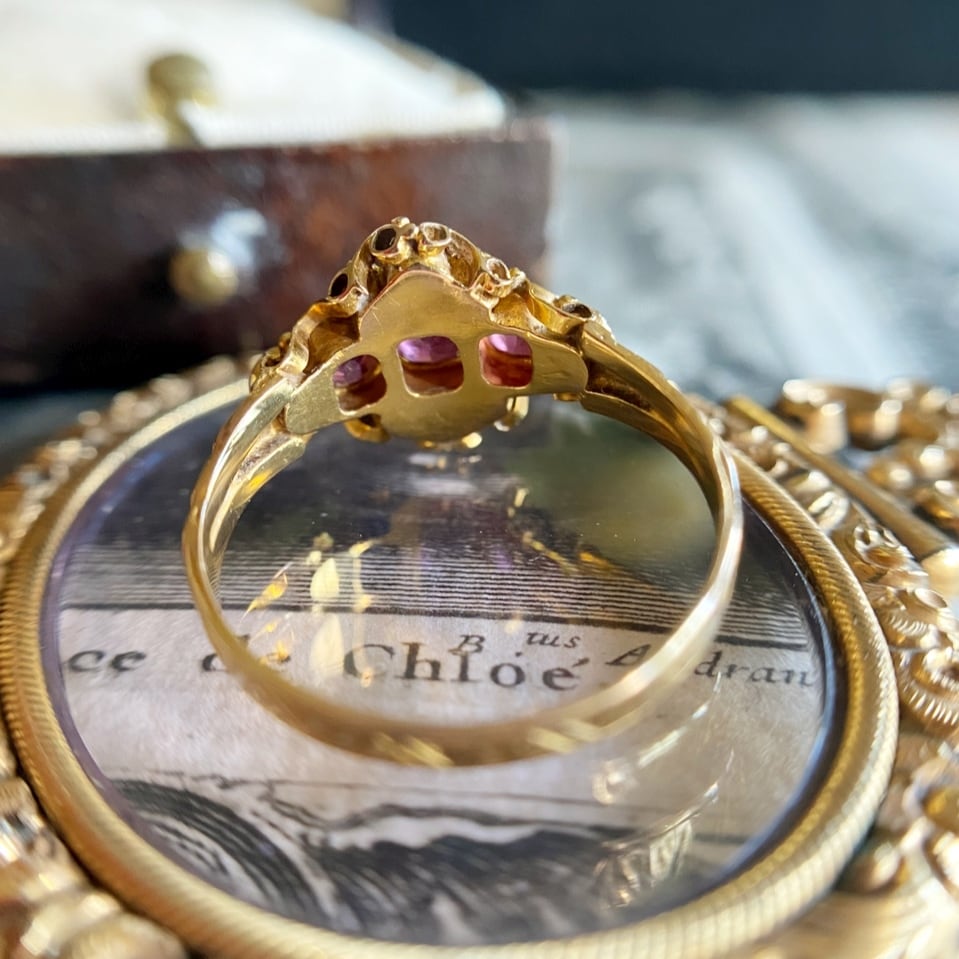 パープリッシュピンクとローズピンクが溶け合ったようなその独特な色味は、その時代よく使われてきたアメシストよりもピンク色で、でもルビーのような赤とも違い、イエローゴールドの地金によくはえ、より艶やかに輝いてみえます。