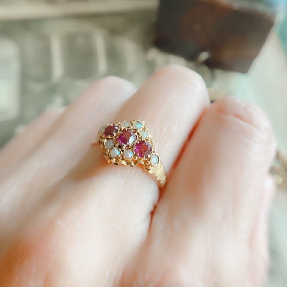 濃いめのロゼワインを思わすロードライトガーネットならではの柔らかなローズパープルカラーの輝きの中に小さな白いパールがまるで泡のように弾けた華やかなヴィクトリアンリングのご紹介です。
