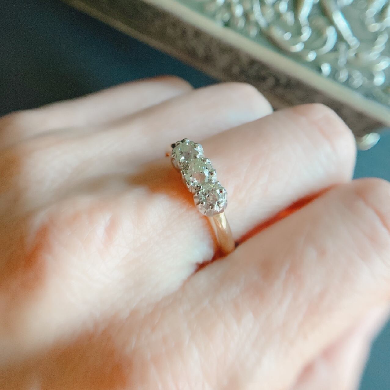 オールドマインカットダイヤモンドスリーストーンリング