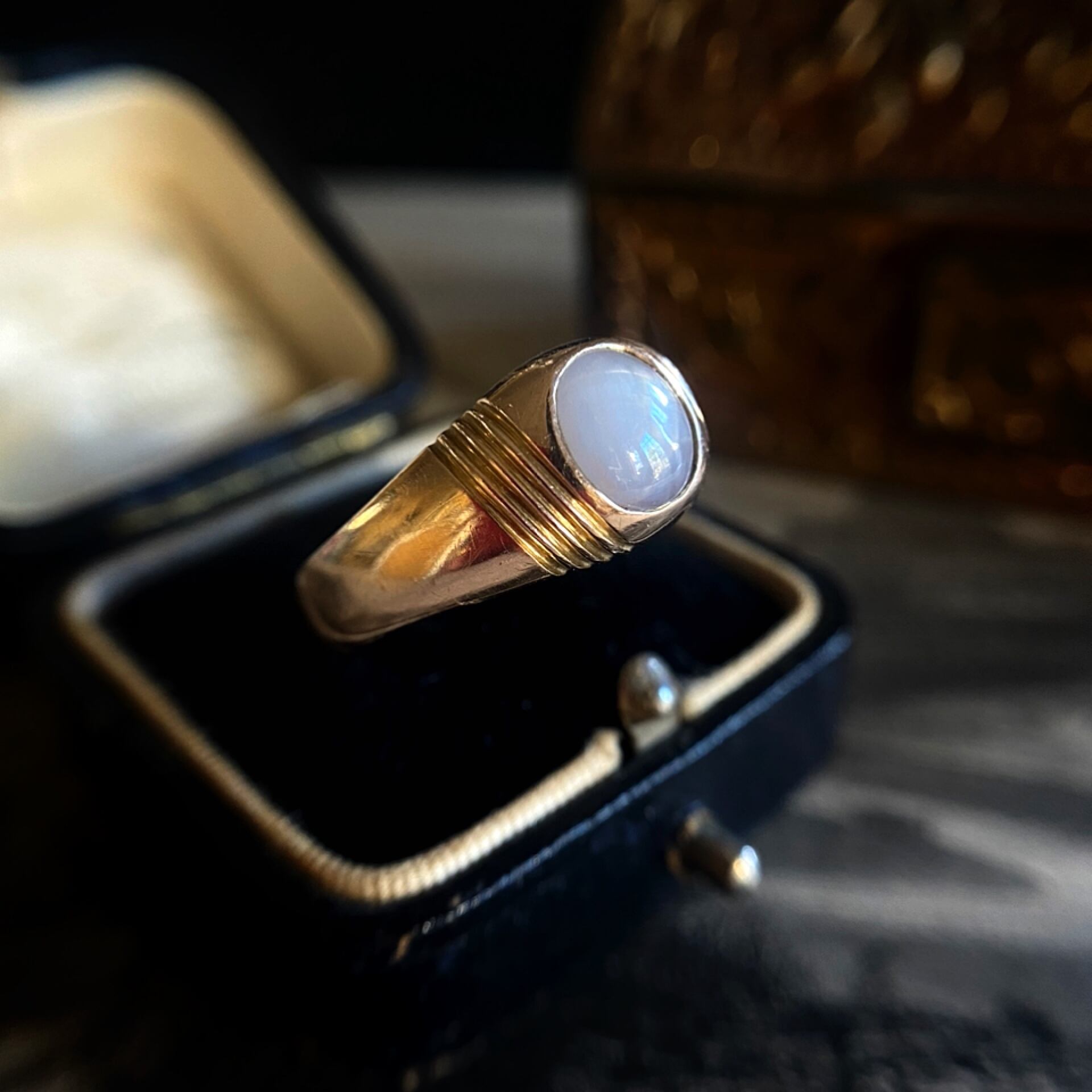 ドーム状に研磨したコロンと山高のカボッションカットが魅力的なサファイアのリング。
