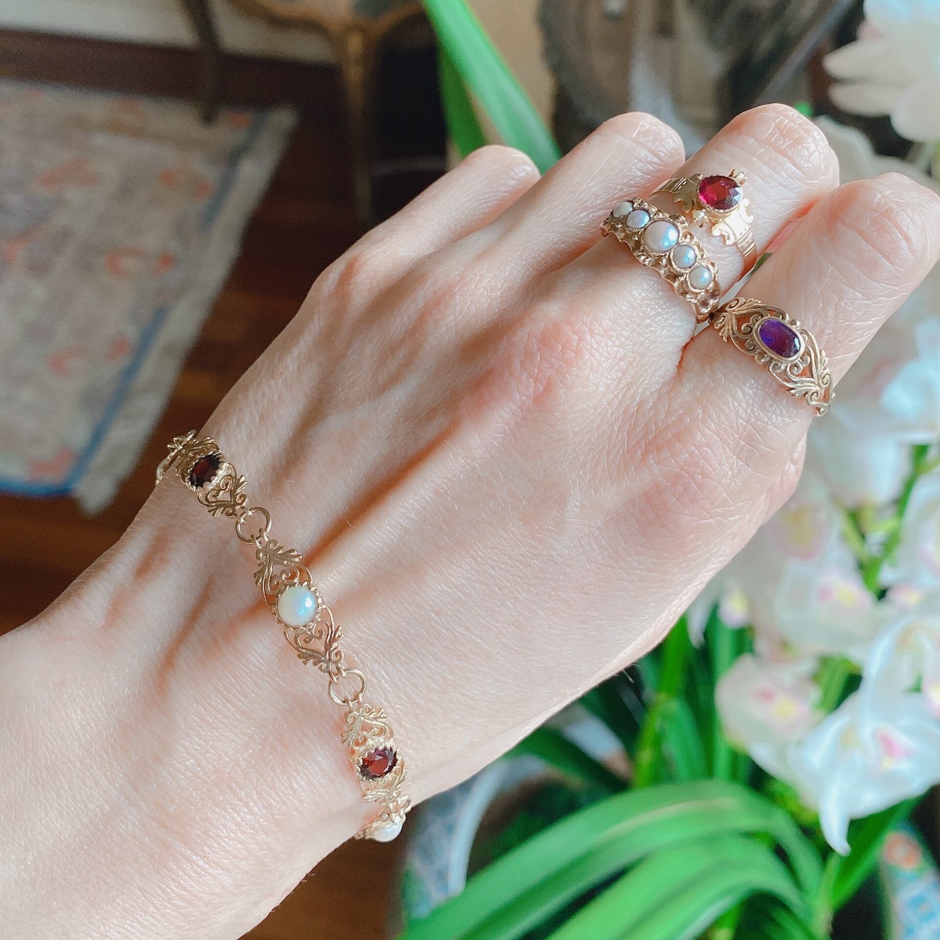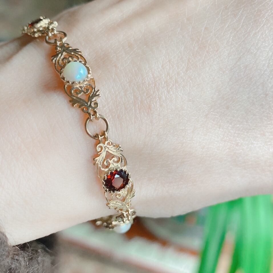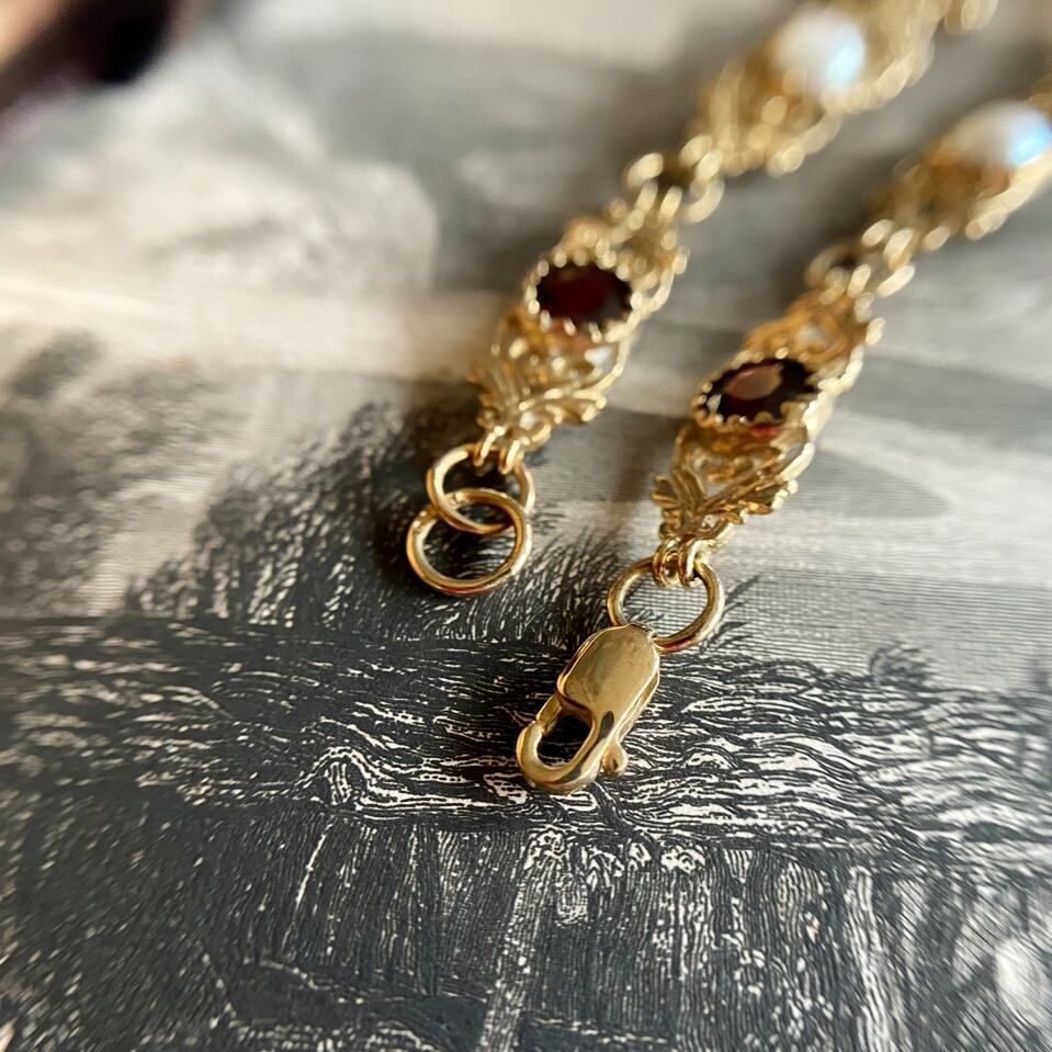 ロードライトガーネット&ハーフパールの透し彫りブレスレット