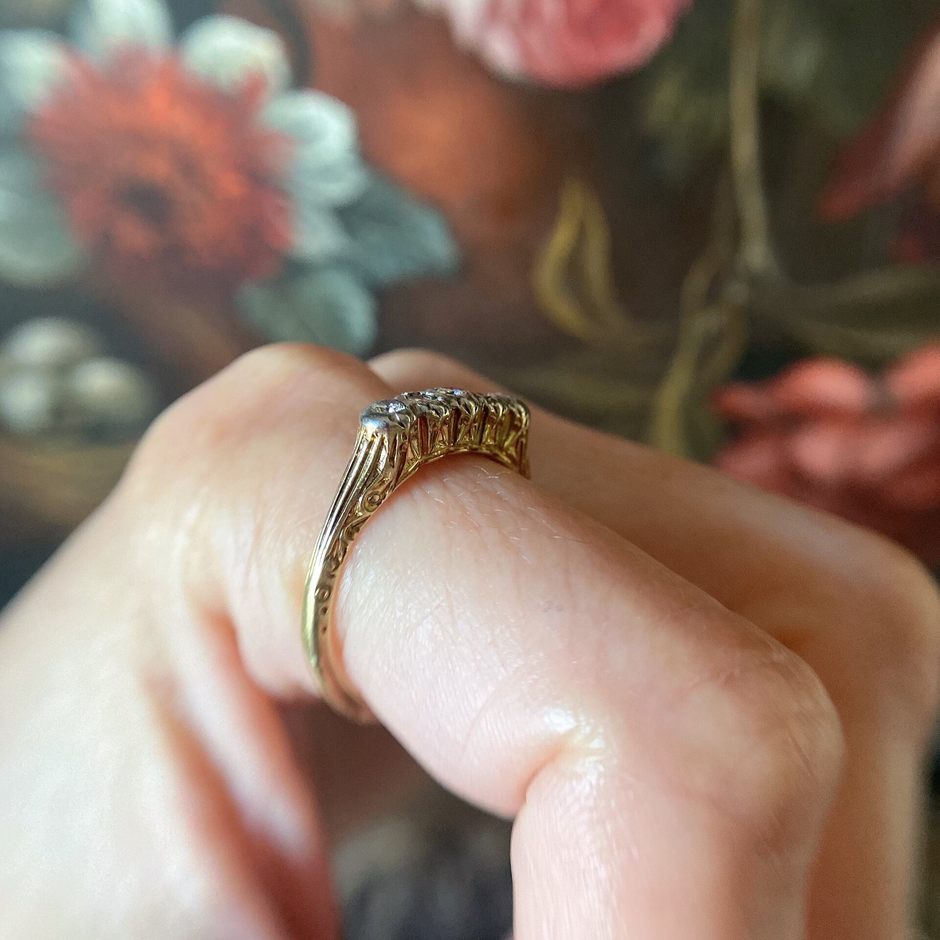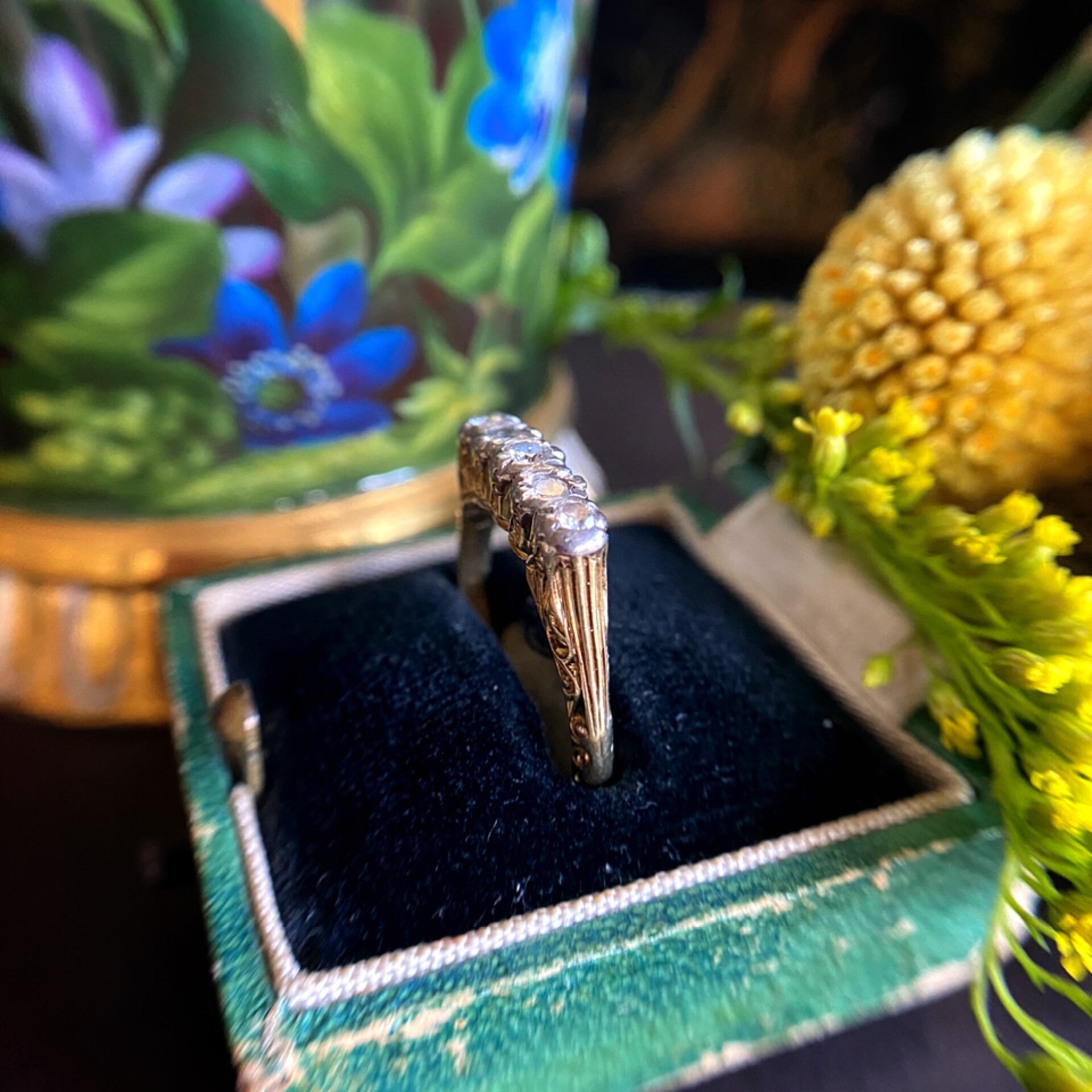 植物の生命の躍動感を感じる彫金を施した立ち上がりから、5石の小さなダイヤモンドが一直線にスッキリと光の矢のグラデーションを作りあげる、ドイツのアールヌーヴォー、つまりユーゲント・シュティールのリングです。
