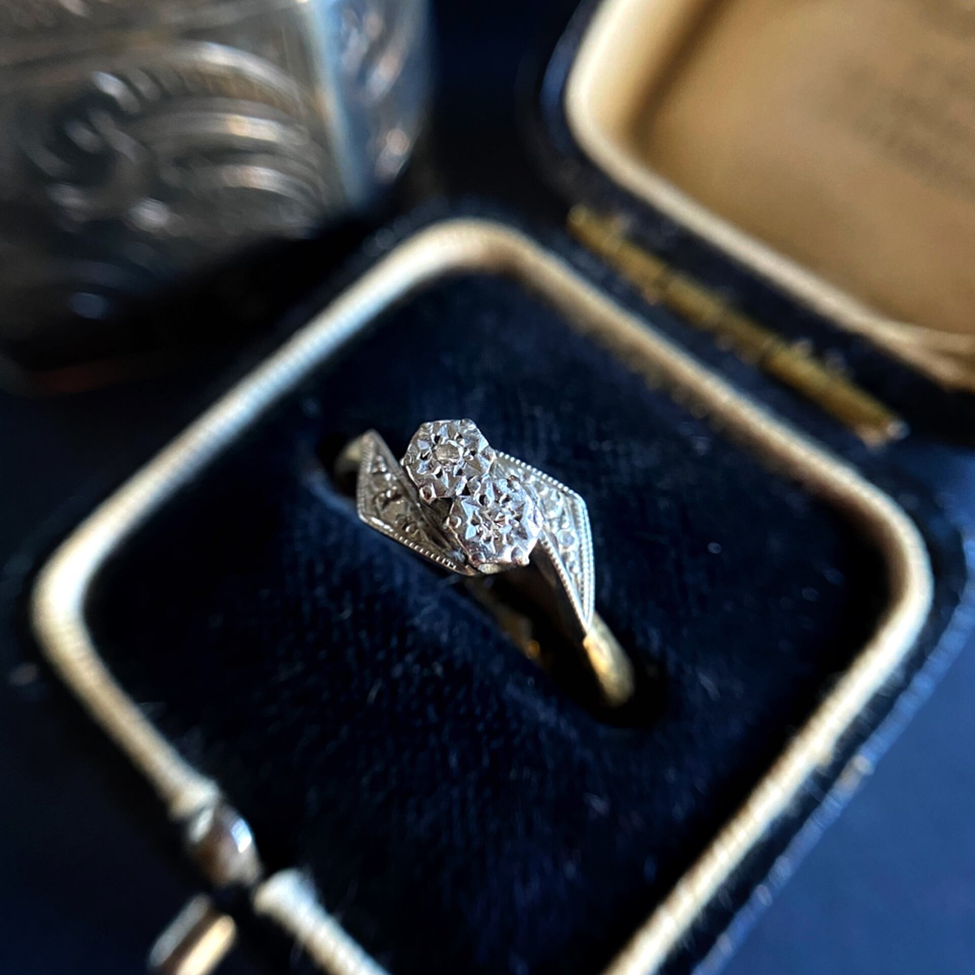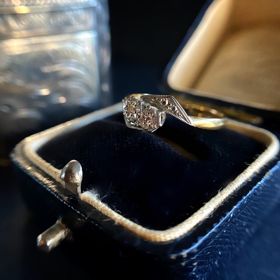 こちらのトワエモワリングは通常見かける物よりもアールデコ感が際立っており、シャープなアクセントはノスタルジーを感じさせつつも都会的な感じもあり、洗練されたスマートなひと品です。