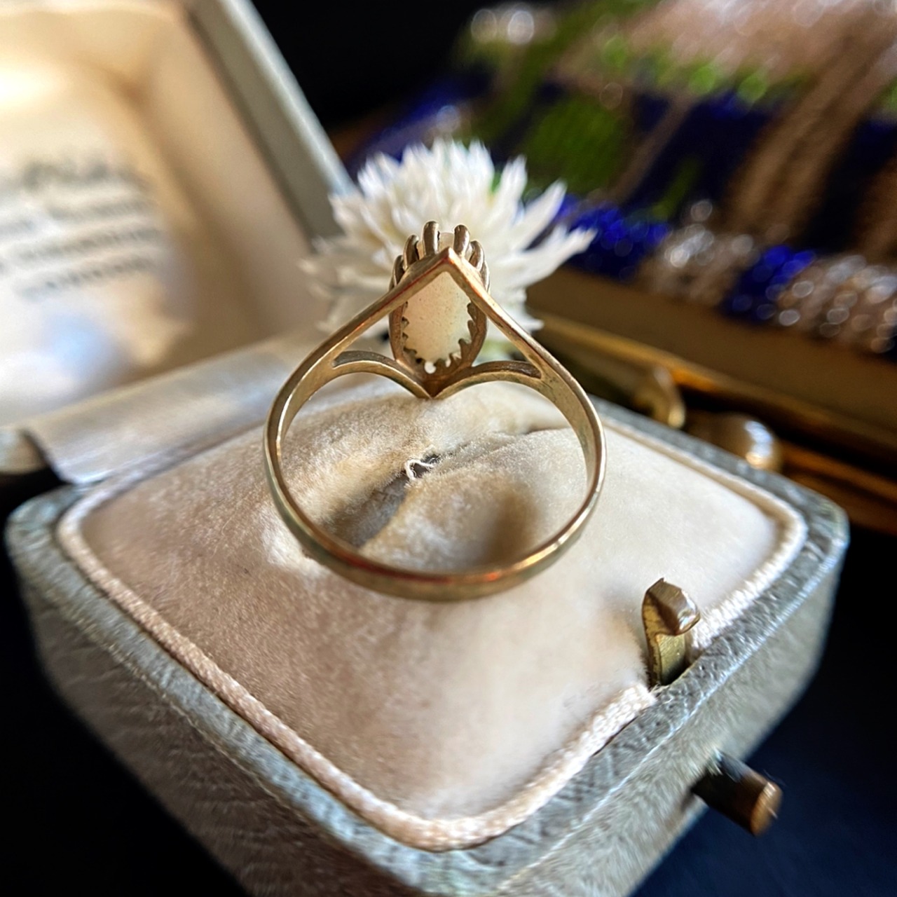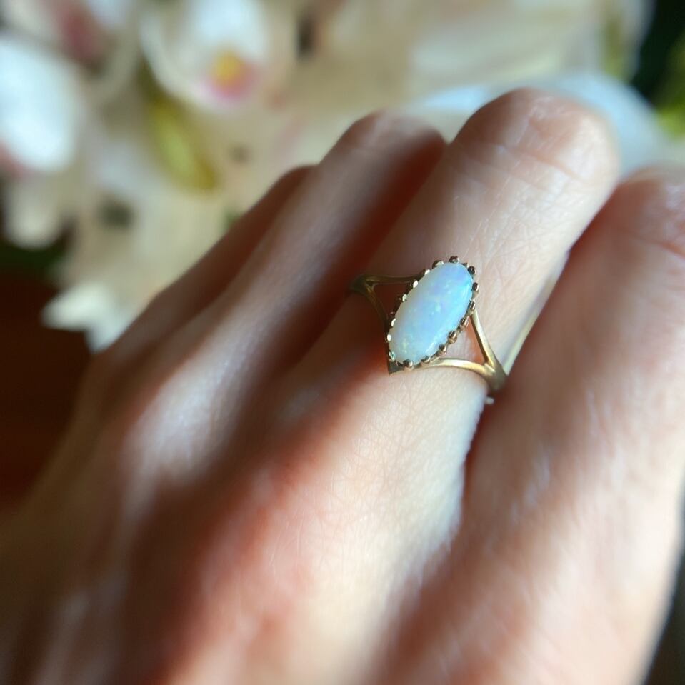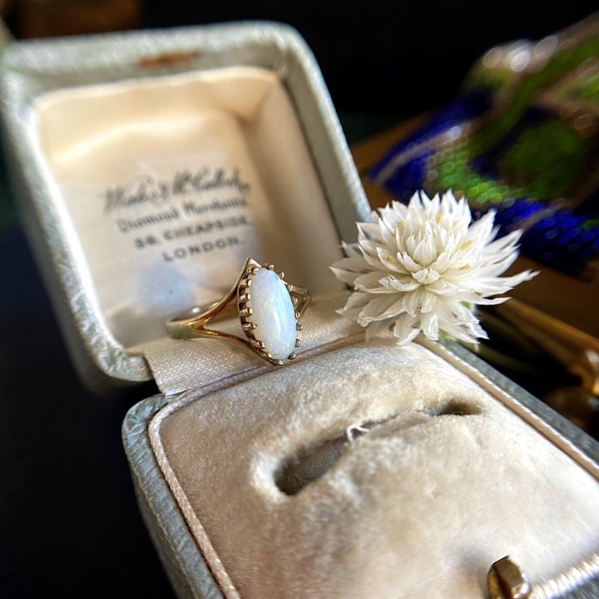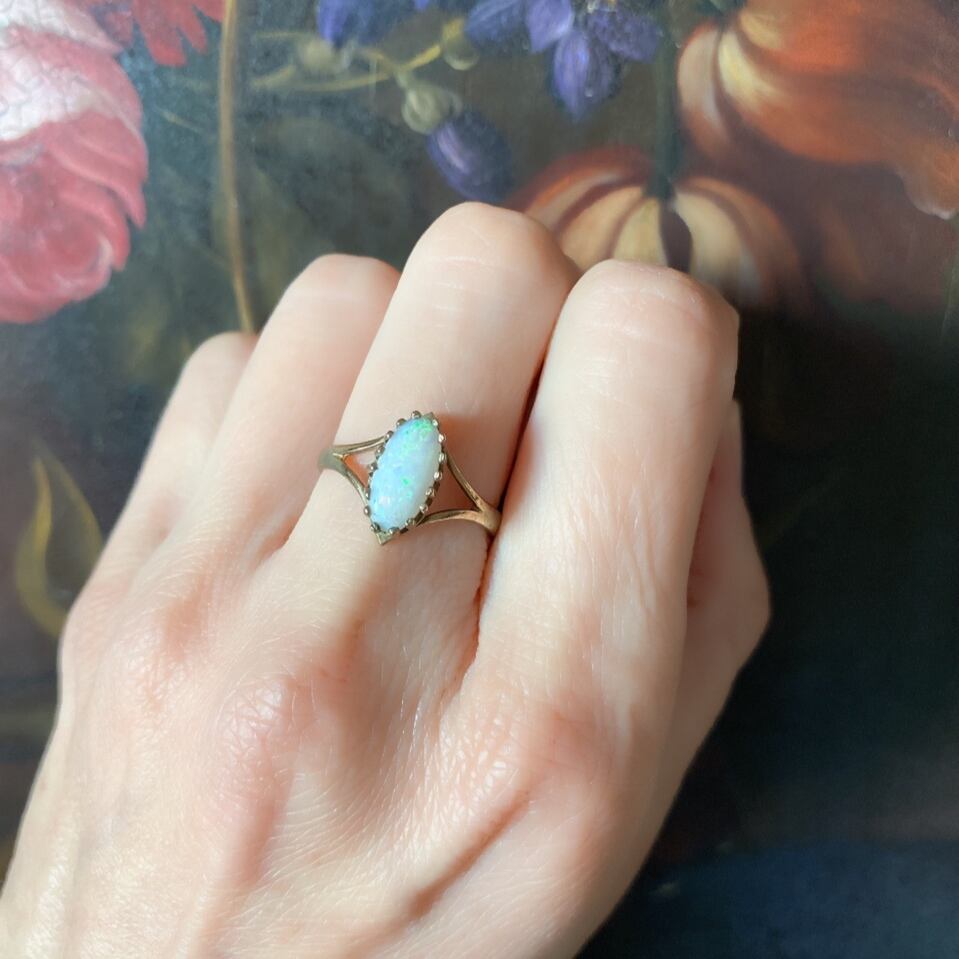 デリケートな石の為アンティークの物になると時の経過分だけ表面が幾分マットで輝きが薄れてしまっている事が多くあります。こちらの石も時代によるマット感が少し見受けられますが、キズやカケはなく、クリーミーな優しい浮遊色を見せてくれる穏やかなオパールリングです。