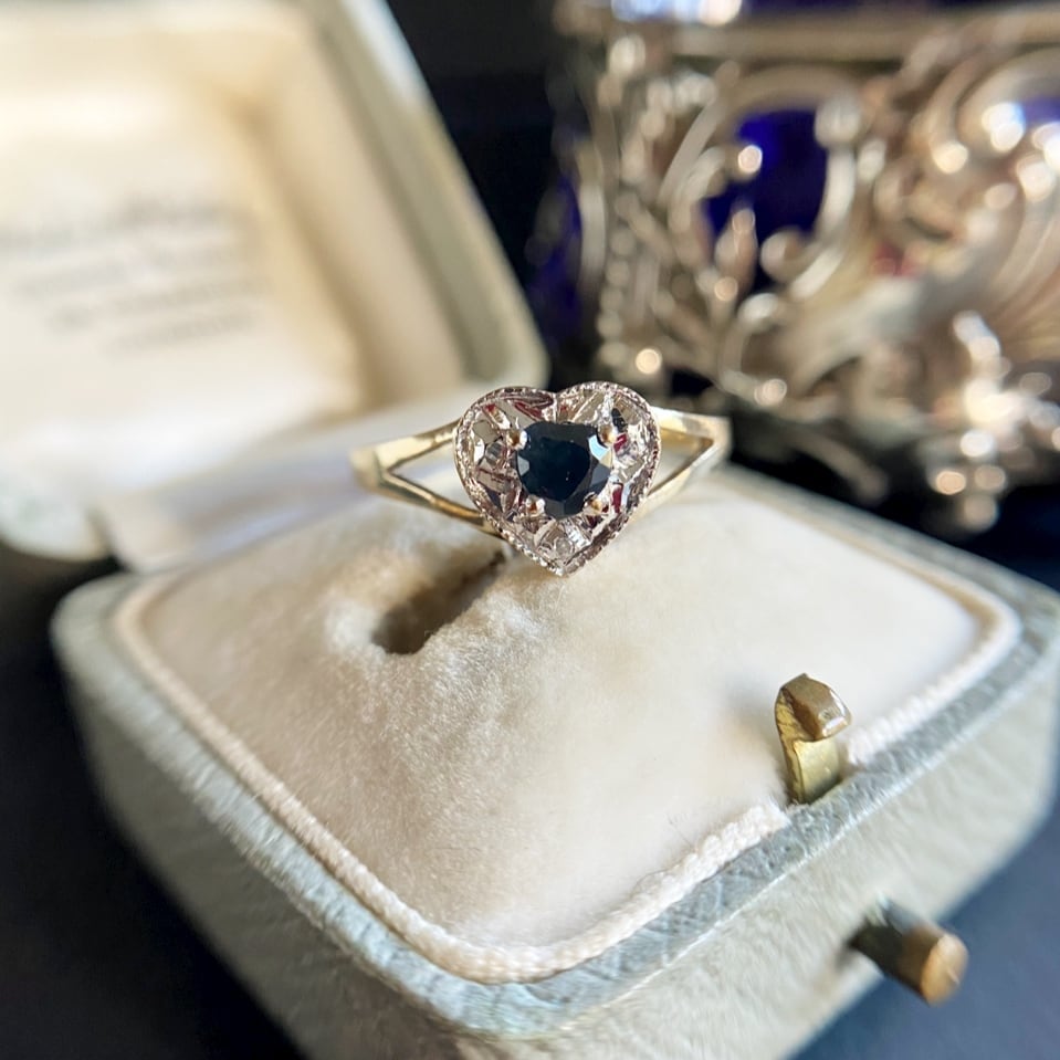 ふっくらと愛らしい形のハート型のフェイスには、これもまたハート型のブラックサファイアをセットした、心ときめくリング。
