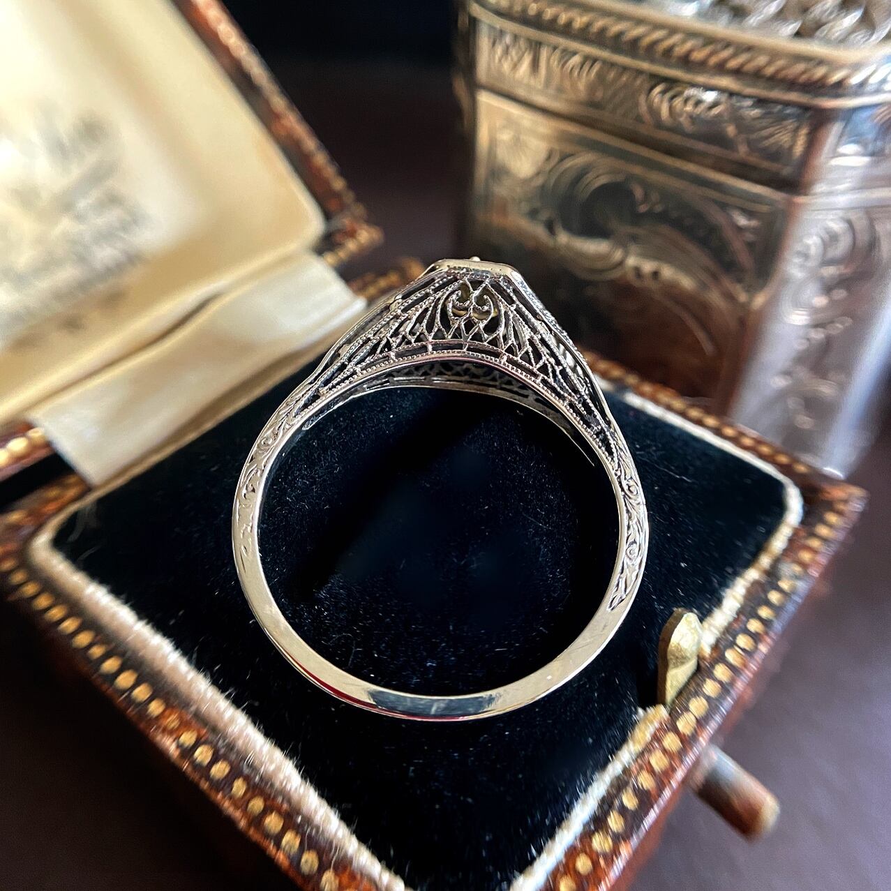 美しいフィリグリー、透かしが立体的に彫られ、それがゴールドという硬い材質とは思えない程にハンドメイドの繊細な彫りにうっとりと眺めてしまいます。そしてそこに打ち込まれた無数のミルグレインが光と影を作り出し、モノトーンの白銀色の世界が生み出す小さな世界に優美さを感じるアールデコリングです。