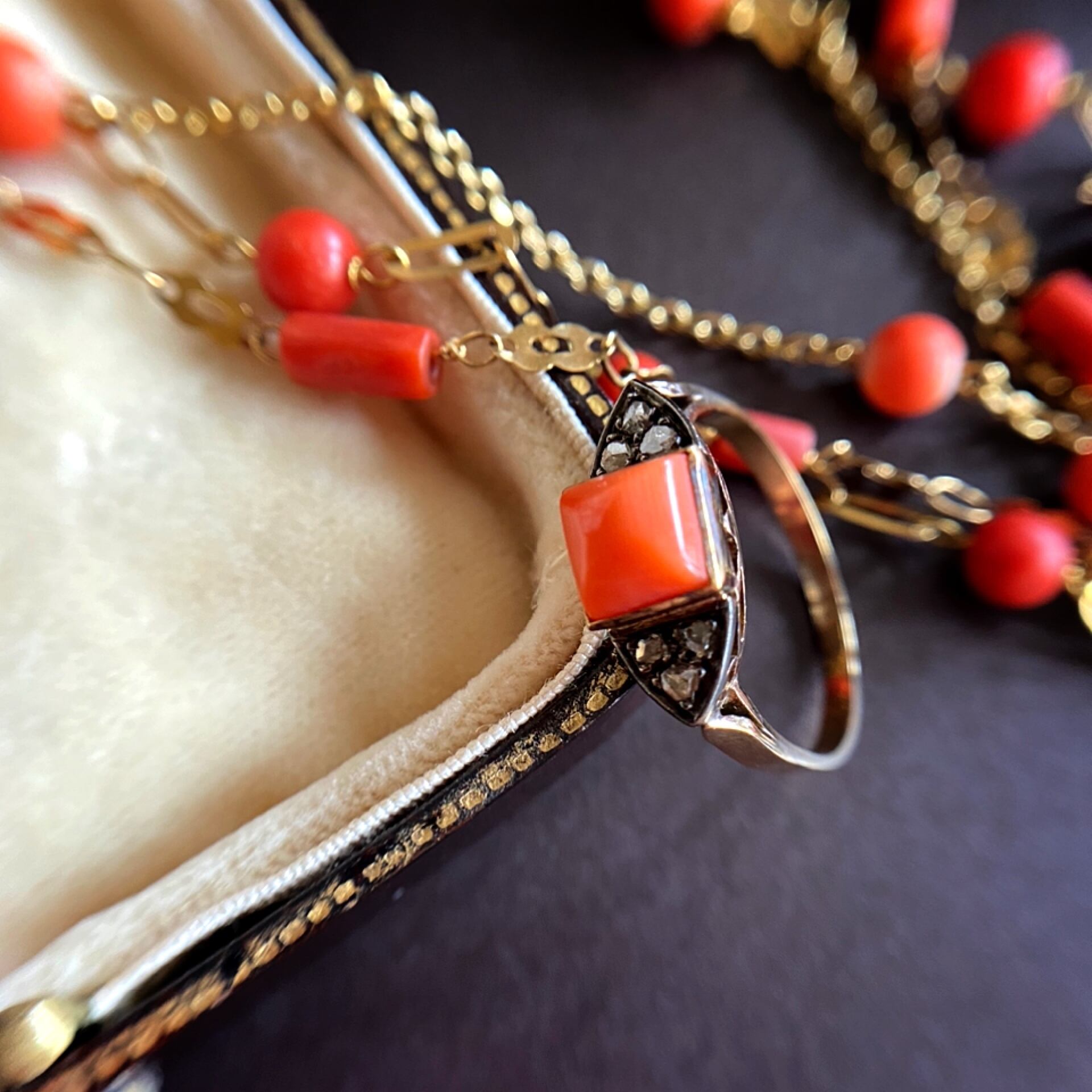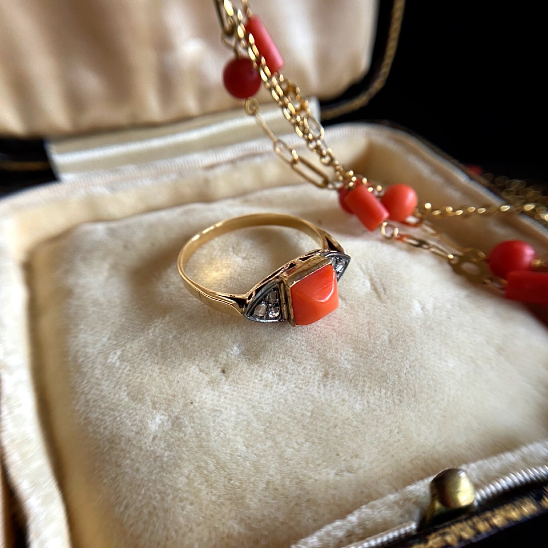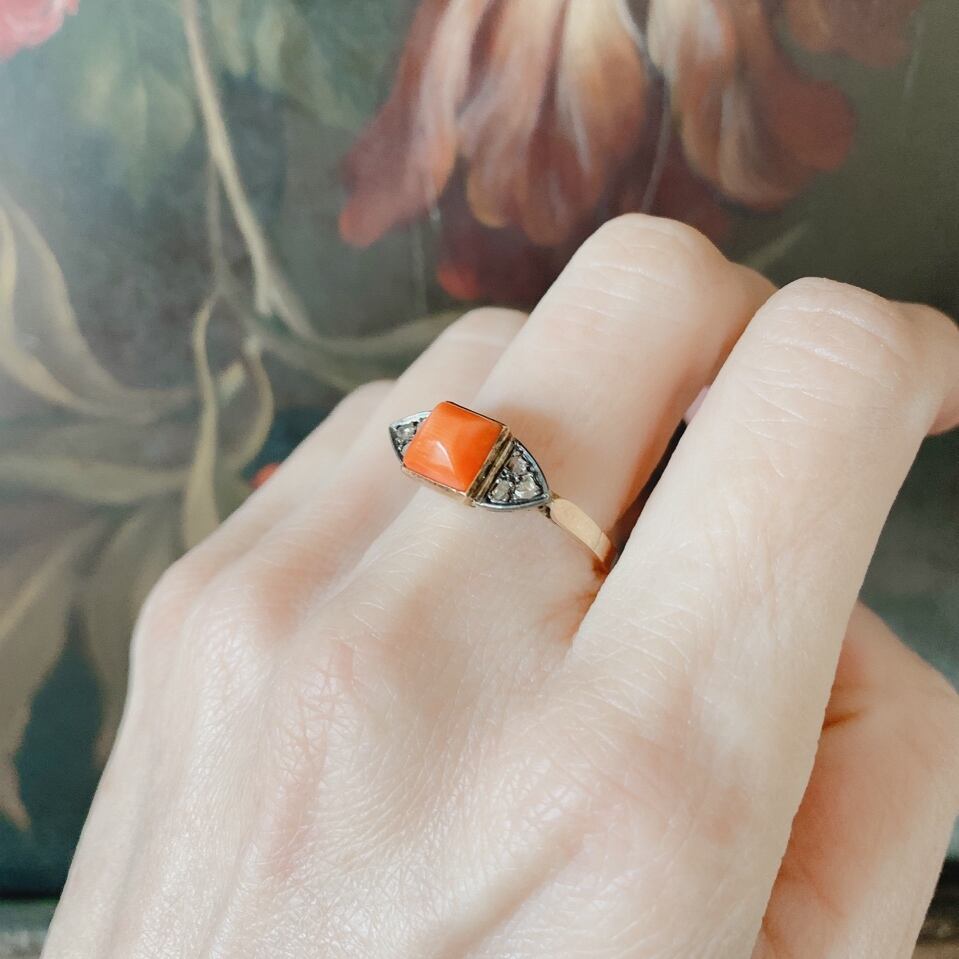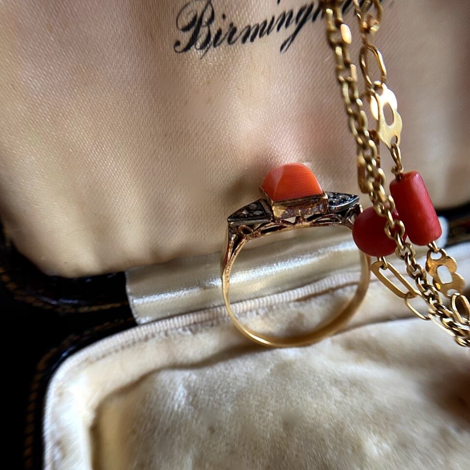 現代の珊瑚のリングってなかなか素敵な物ってないですよね、でもアンティークの珊瑚ジュエリーはこのように素敵な物が沢山あるのです。その中でもこちらのリングはヴィクトリアンジュエリーなどとは一味も二味も違う魅力のある絶品です。