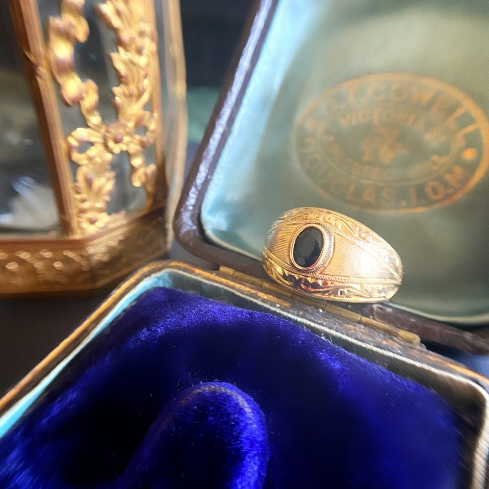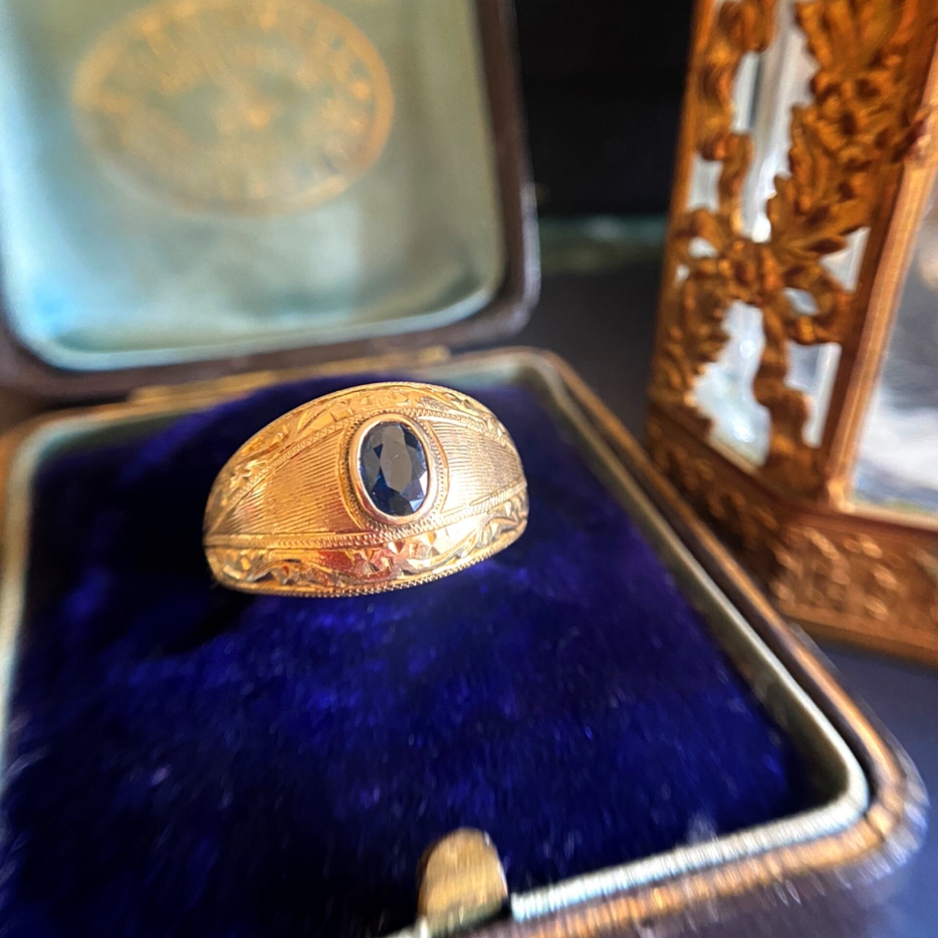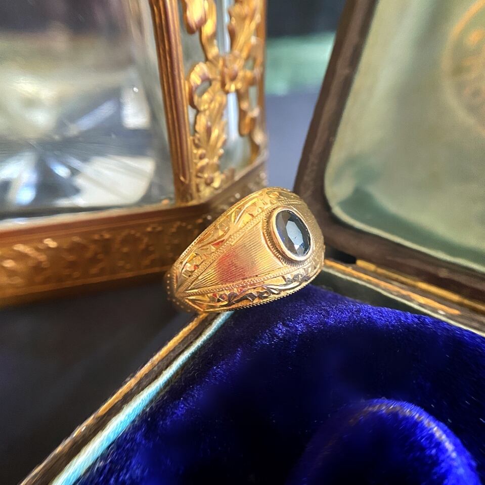 約6mm×4.5mmの濃密なネイビーカラーのオーバルカットサファイアがすっぽりとオープンセッティングでセットされ、二等辺三角形の部分には金線のようないくつもの細かい直線がデザインされ、ボーダーにはアカンサスの葉が躍動的に表現されて、リングという小さなステージに、よくみると手の込んだデザインが浮かび上がり、つくづくカッコいいリングだなーと感心してしまうのです。