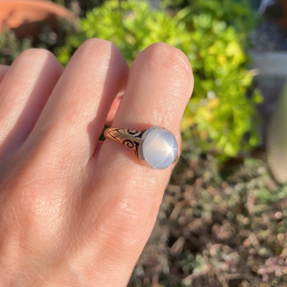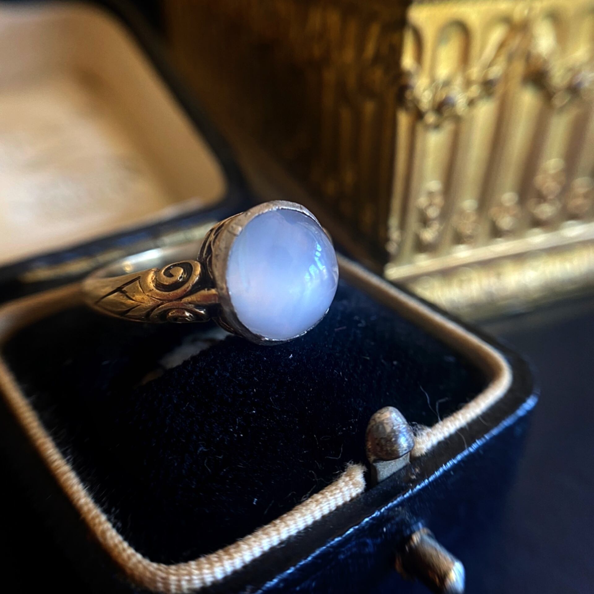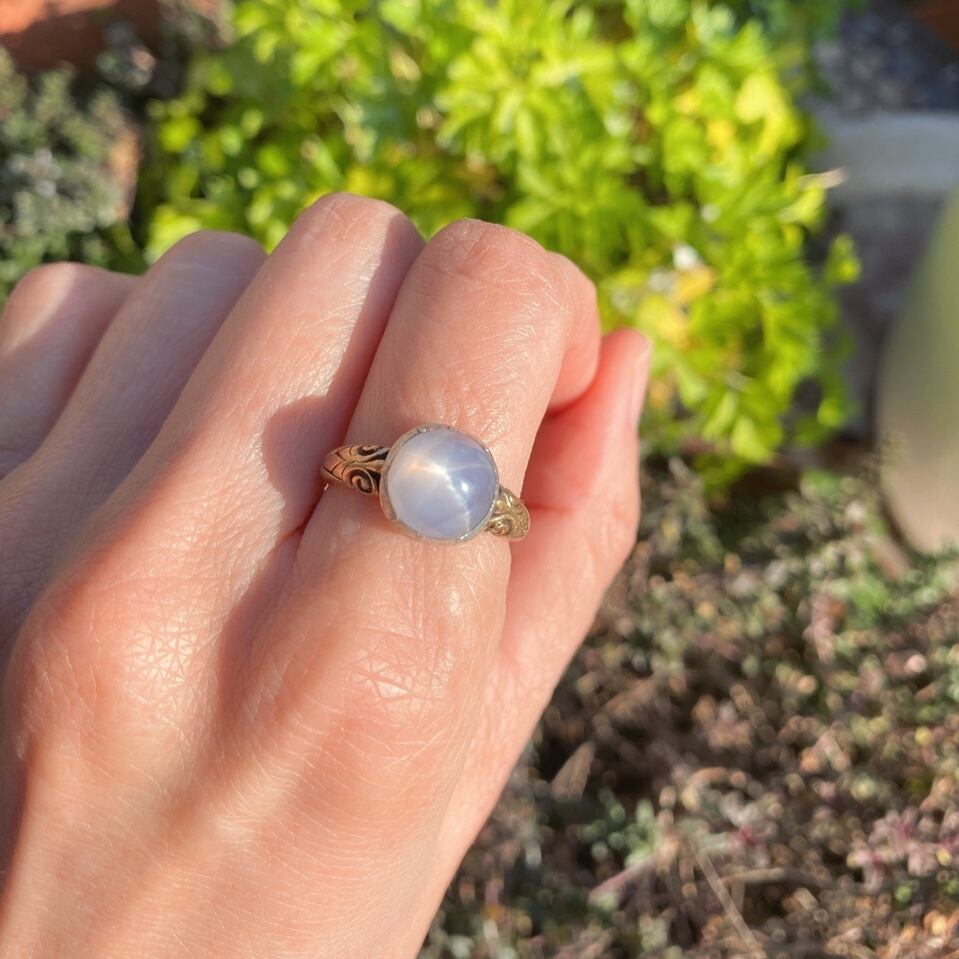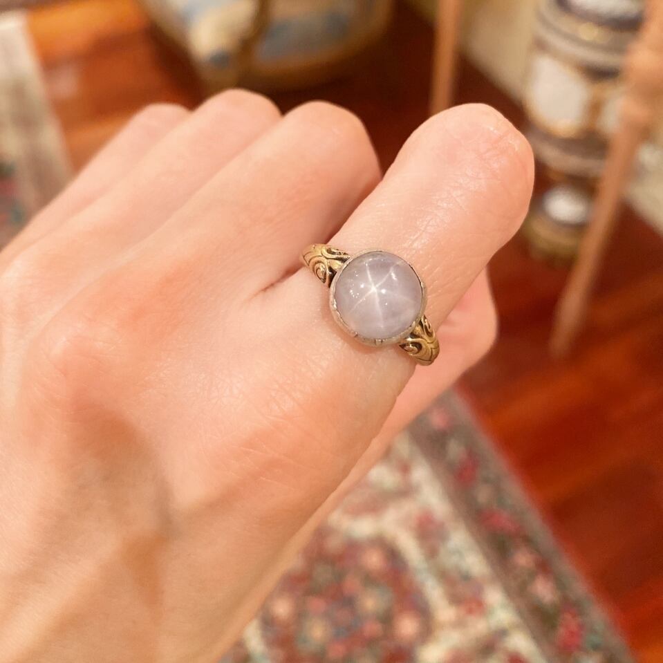 アイスラベンダーブルーグレーのニュアンスカラーと、白いベールがかかったようなシルキーな光沢、ドーム状に研磨したコロンと山高のカボッションカットが魅力的な非加熱スターサファイアのヴィクトリアンリング。