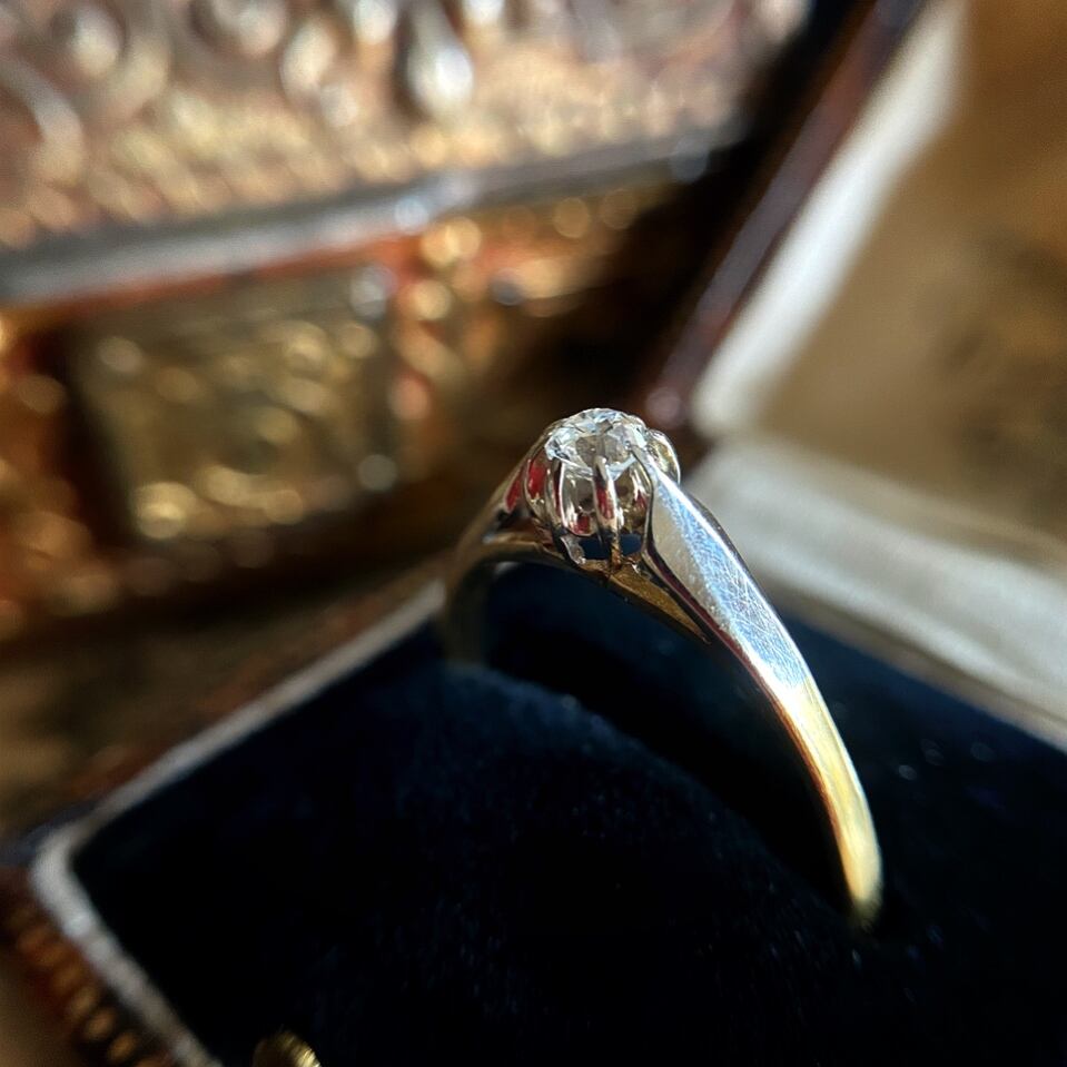 シンプルなシャンクのその先に一粒、凛と明るく輝くオールドヨーロピアンカットダイヤモンドがセットされたソリテールリング。