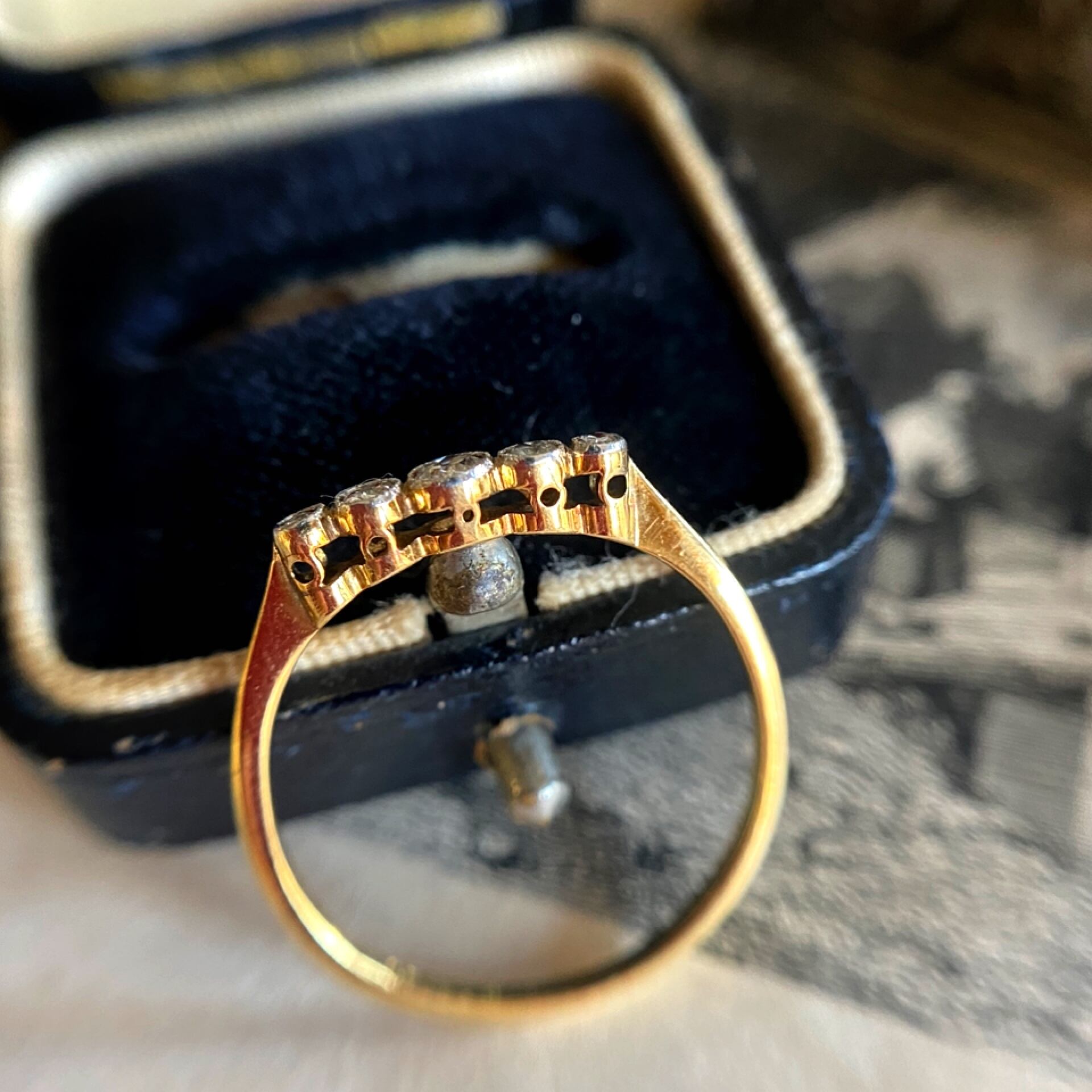 艶やかなゴールドの台座にプラチナを載せて5石のオールドカットダイヤモンドをグラデーションに並べたエドワーディアンリング。