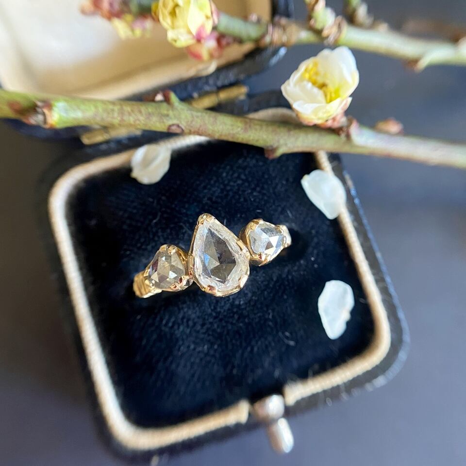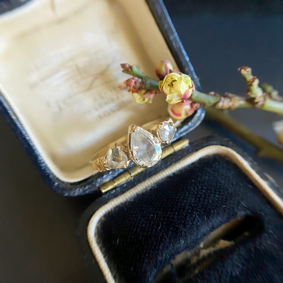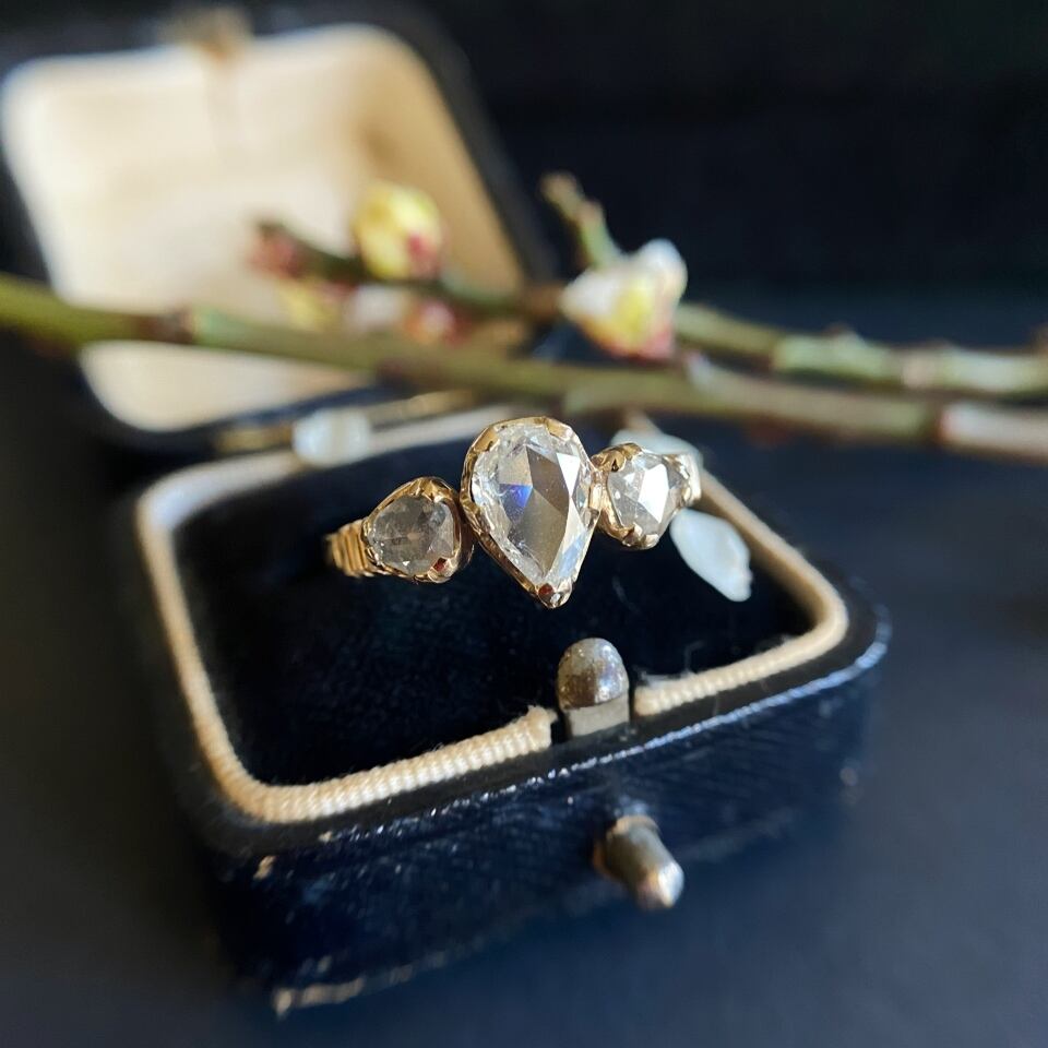 (商談中です。)ペアシェープ&トライアングルシェイプローズカットダイヤモンド スリーストーンリング