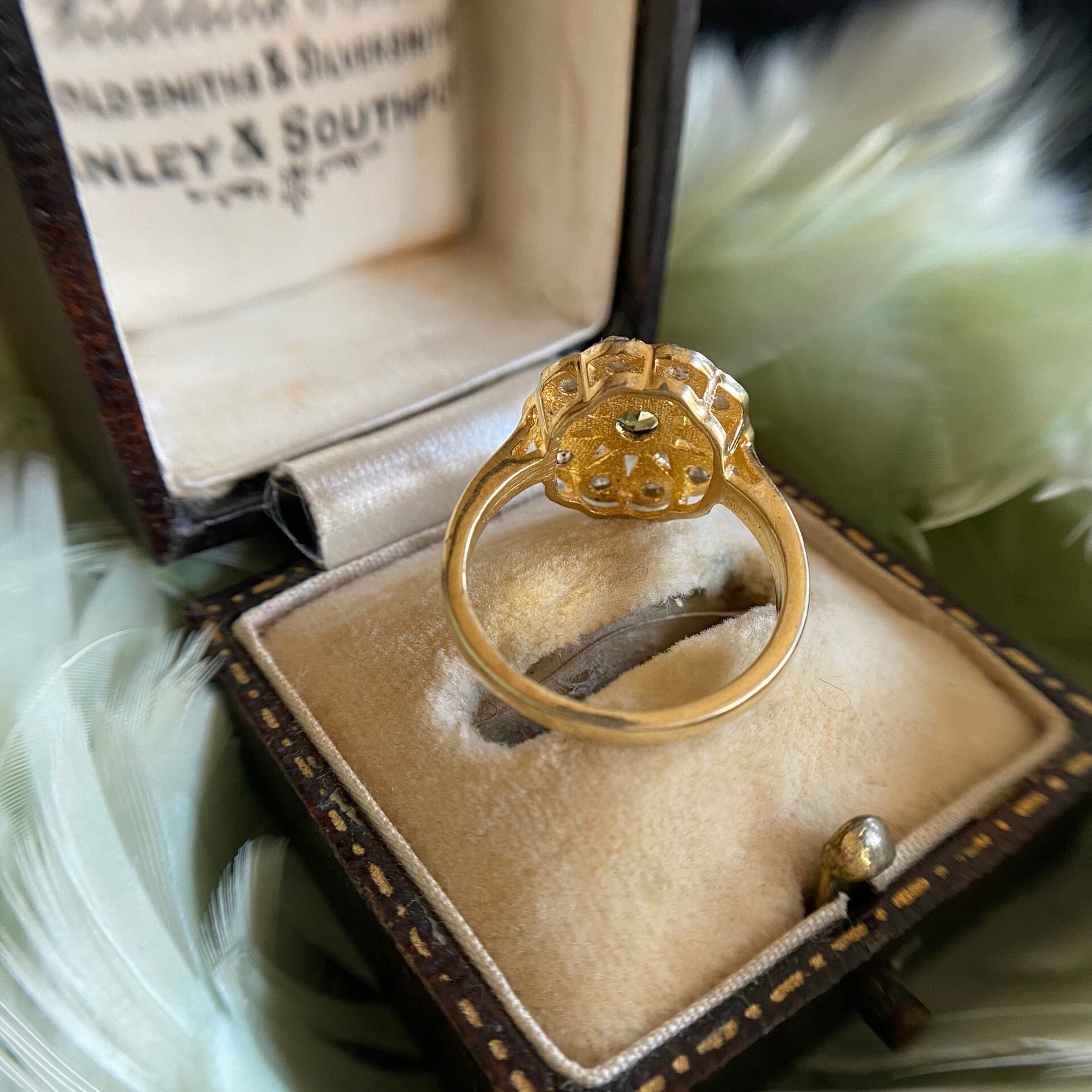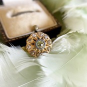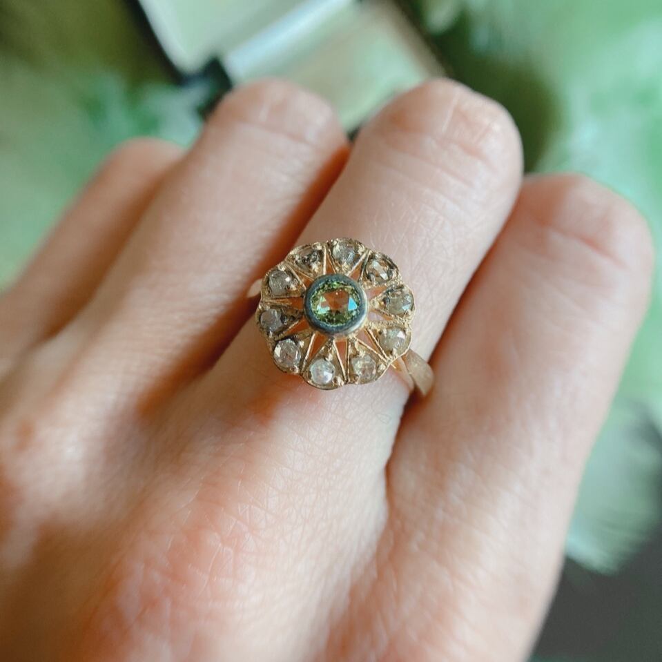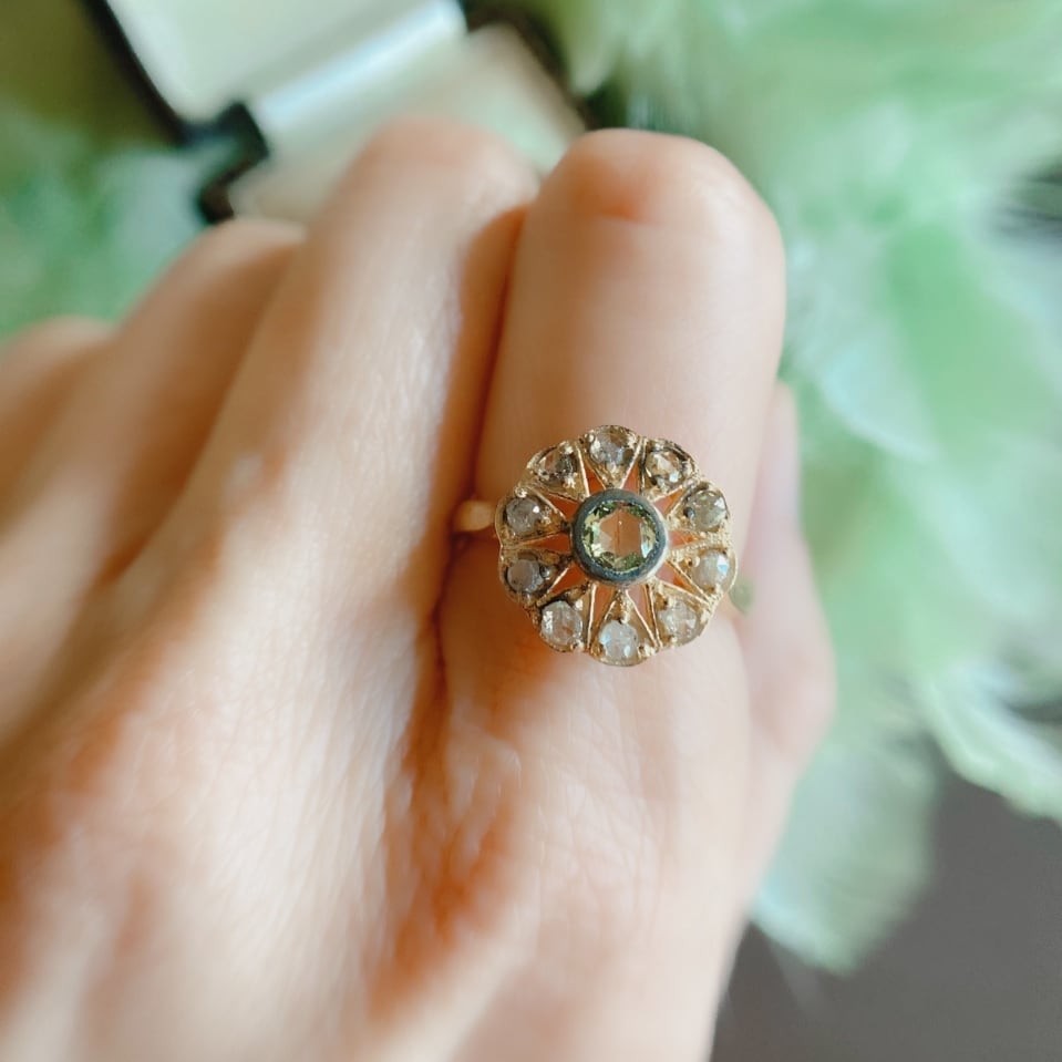 イエローグリーンナチュラルサファイア&ローズカットダイヤモンド フラワーリング