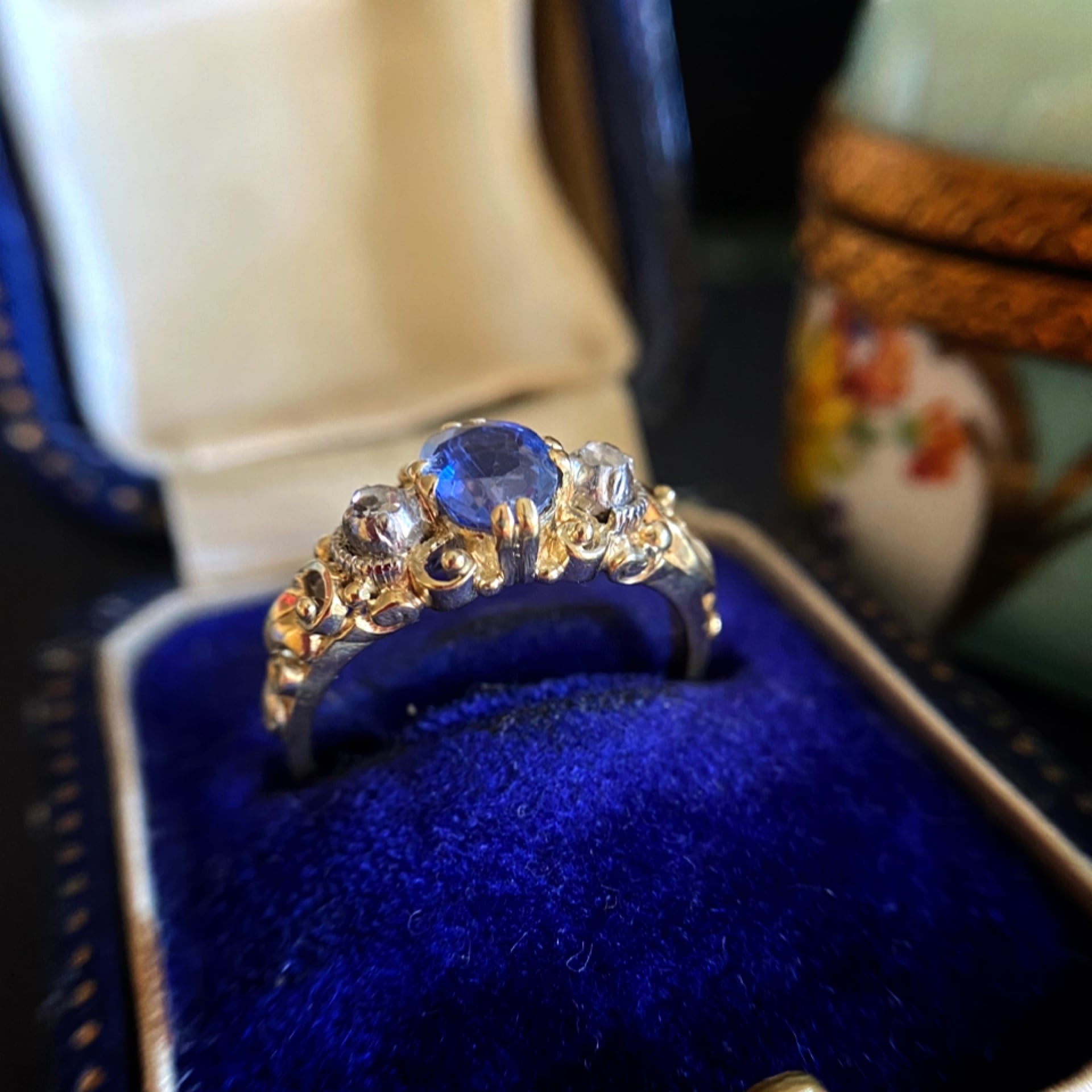 穏やかなクッションカットブルーサファイアの雰囲気に相反するようなデコラティブな彫金は、華美な宮廷文化を受け継ぎつつも、どこかエギゾティックなところはスペインのグラナダ出身のエウヘニア(ナポレオン3世の妻)ぽいかもしれないですね。
