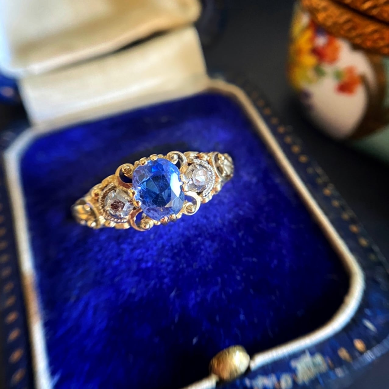 矢車草のような柔らかな青色に吸い込まれそうなほどのブルーサファイアを中央にセット、そのサイドには小さなローズカットダイヤモンドをセットしたデコラティブな彫金が美しいナポレオン三世様式の雰囲気を纏ったリングのご紹介です。