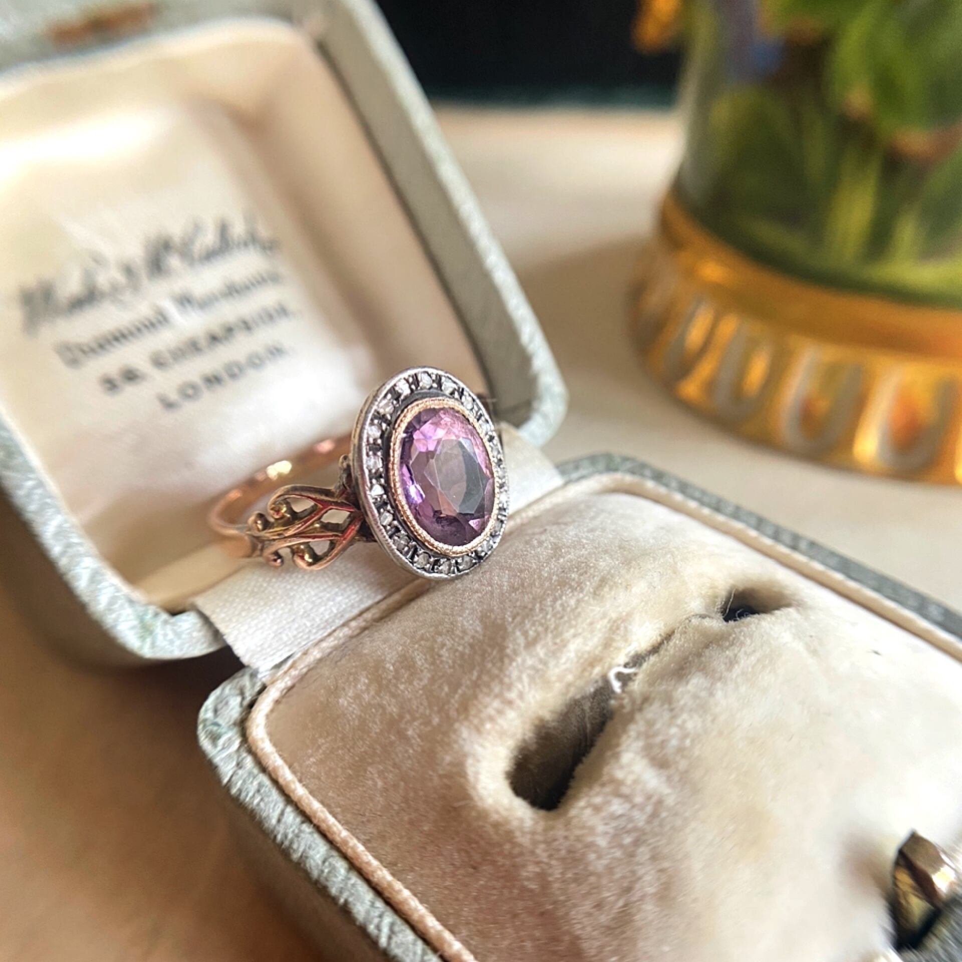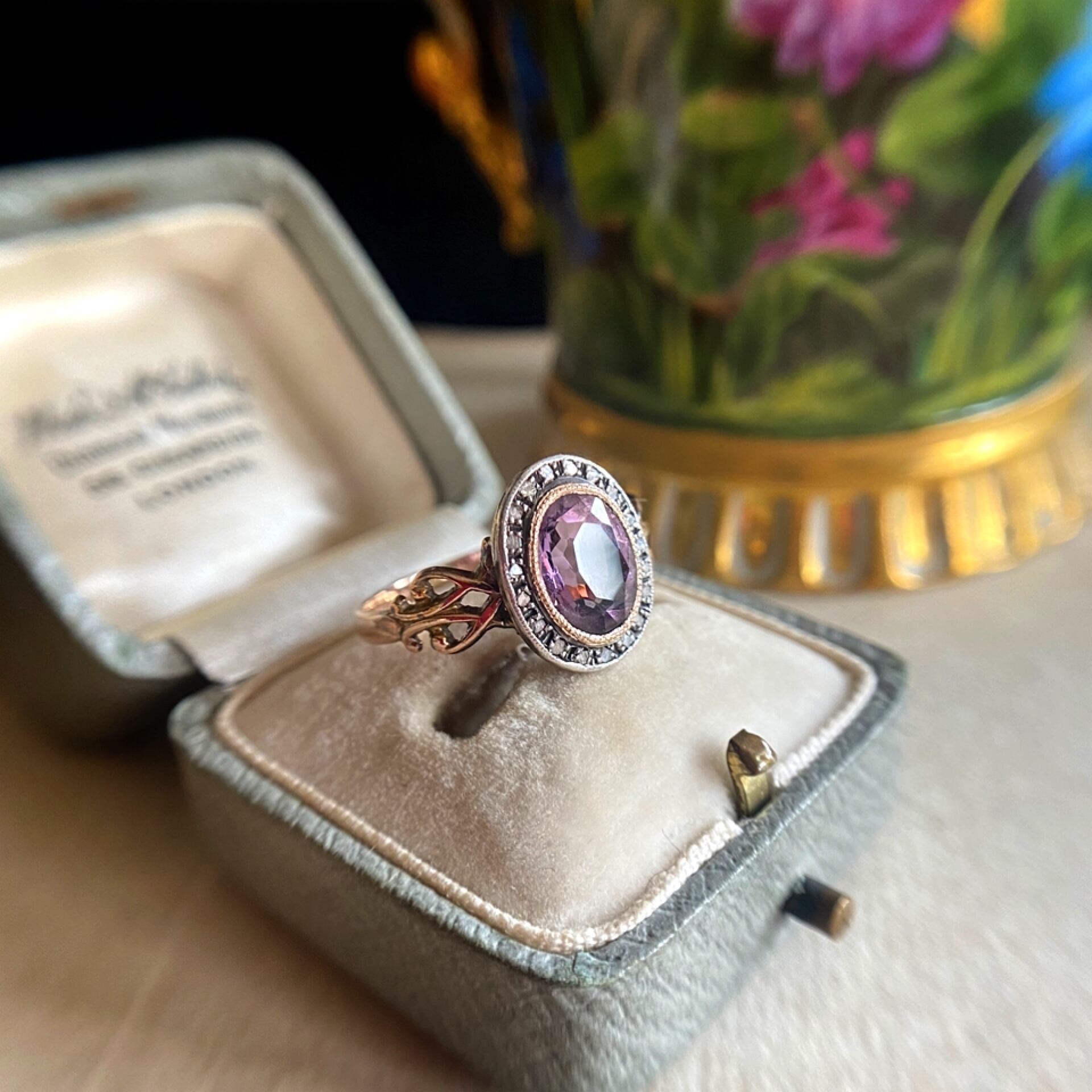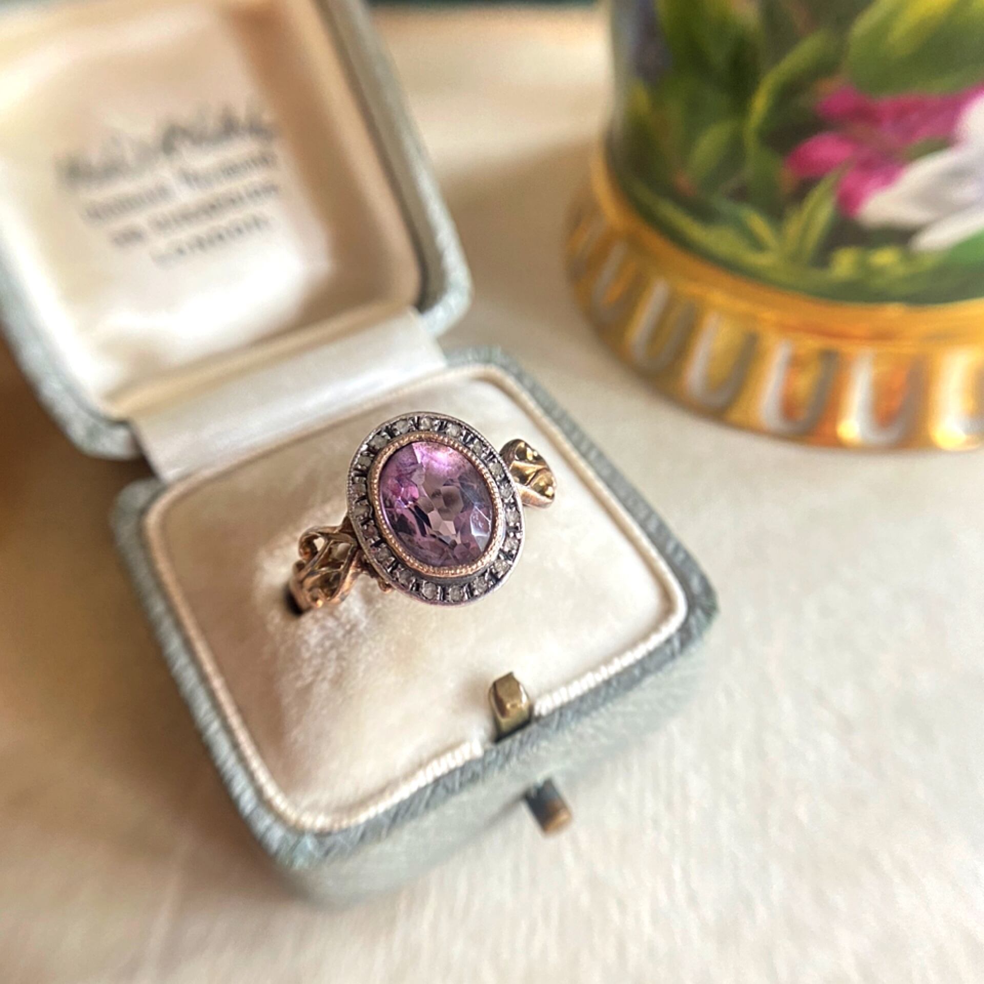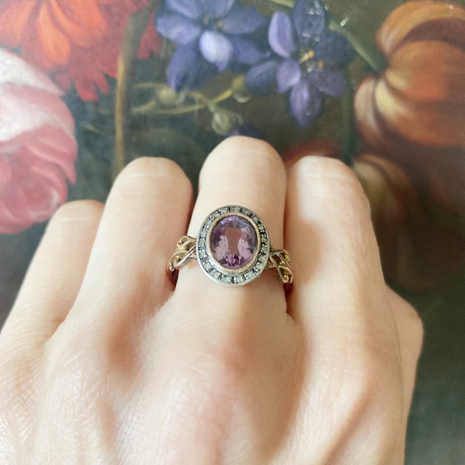 ダイヤモンドやアメジストの枠は職人の手によるもので、歪なところにアンティークの趣を感じてしまいますね。