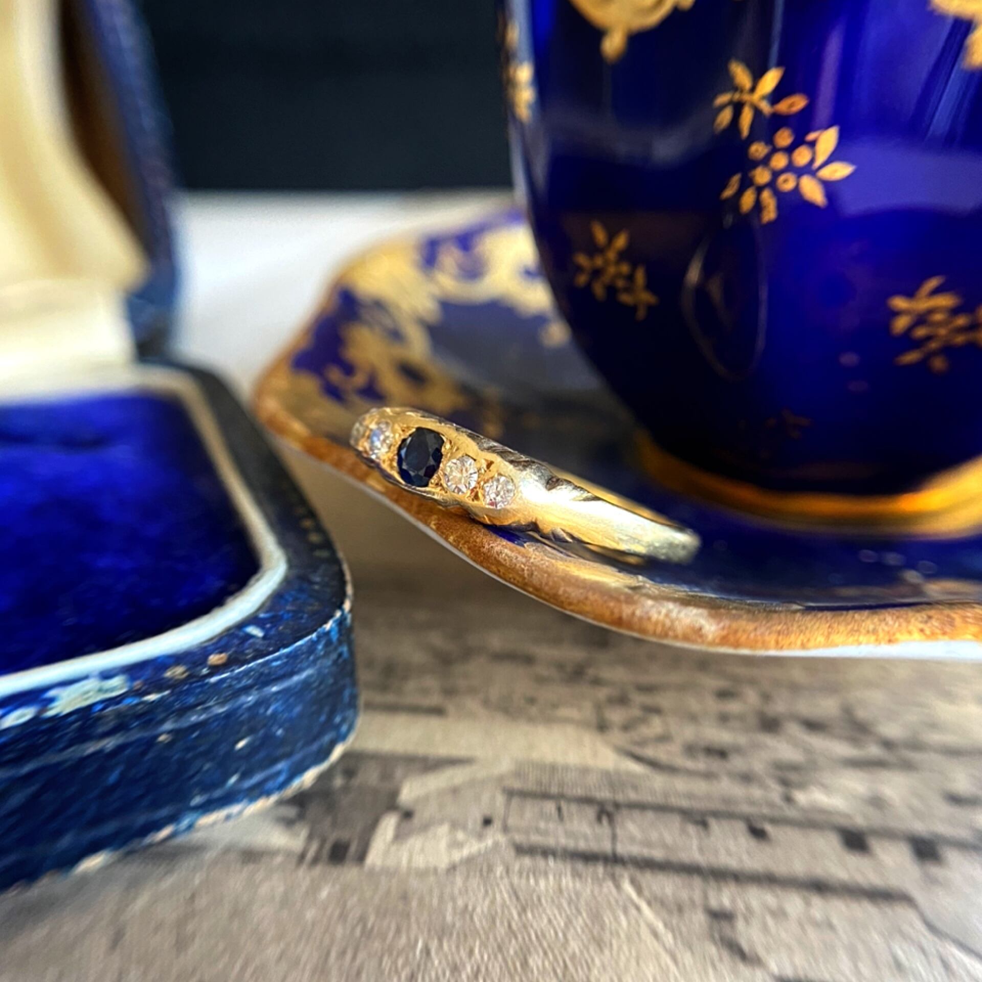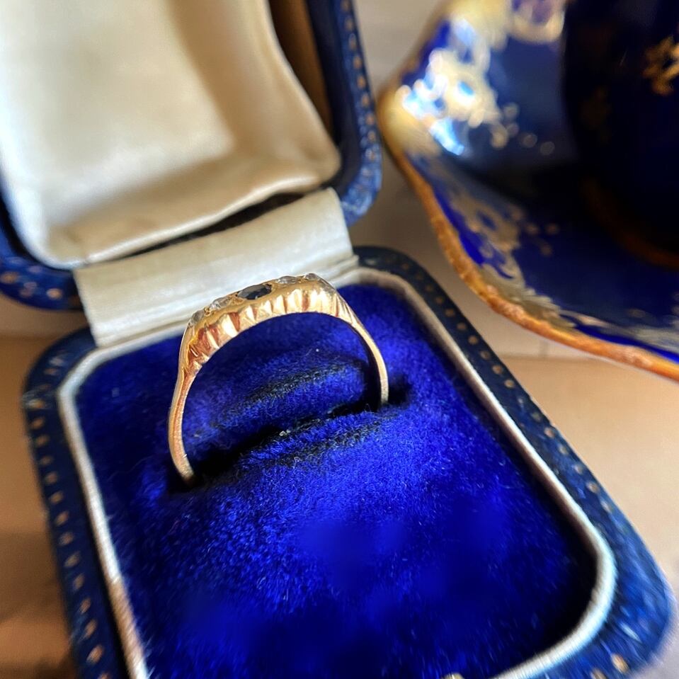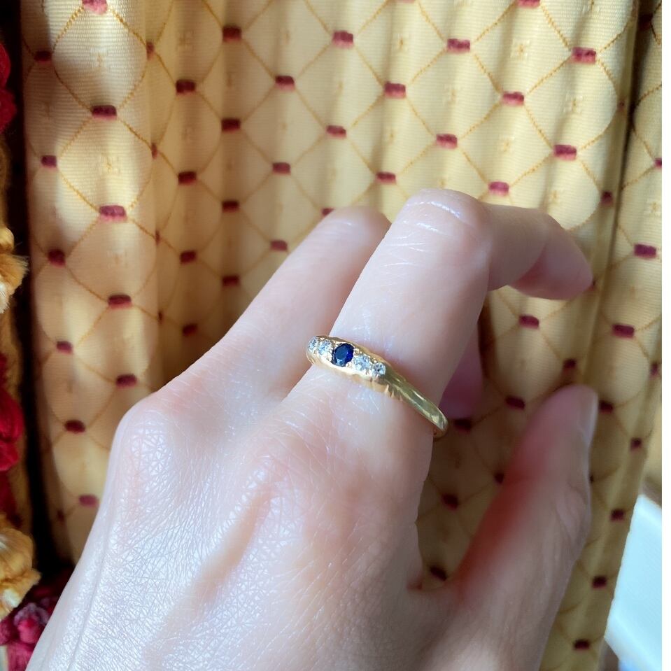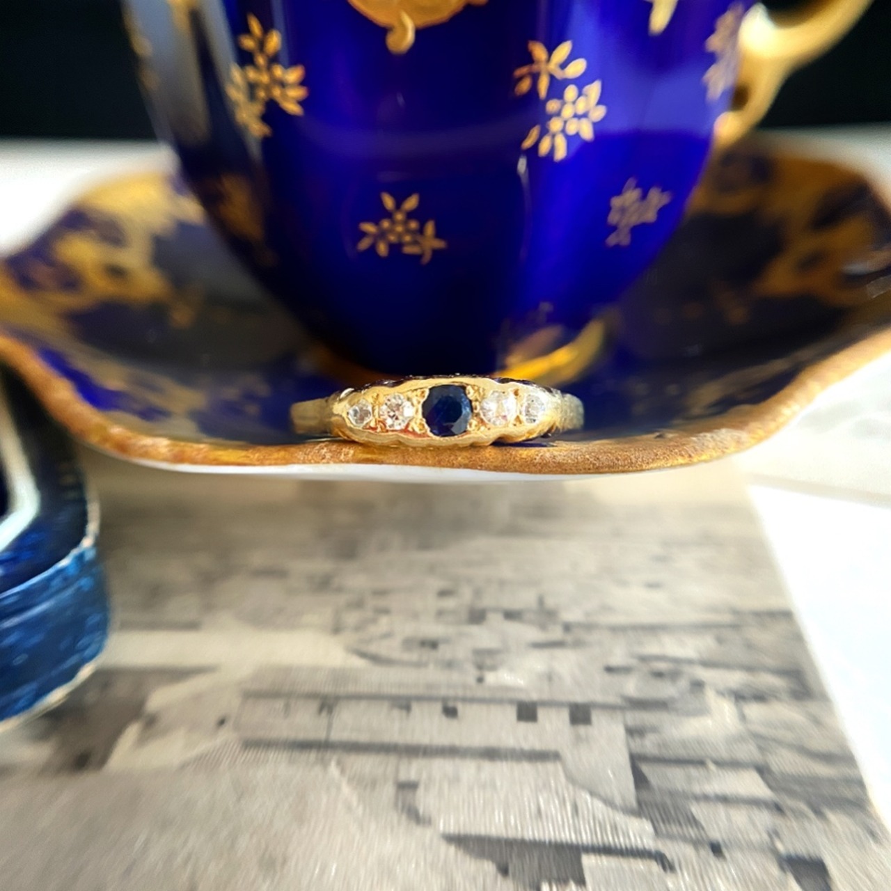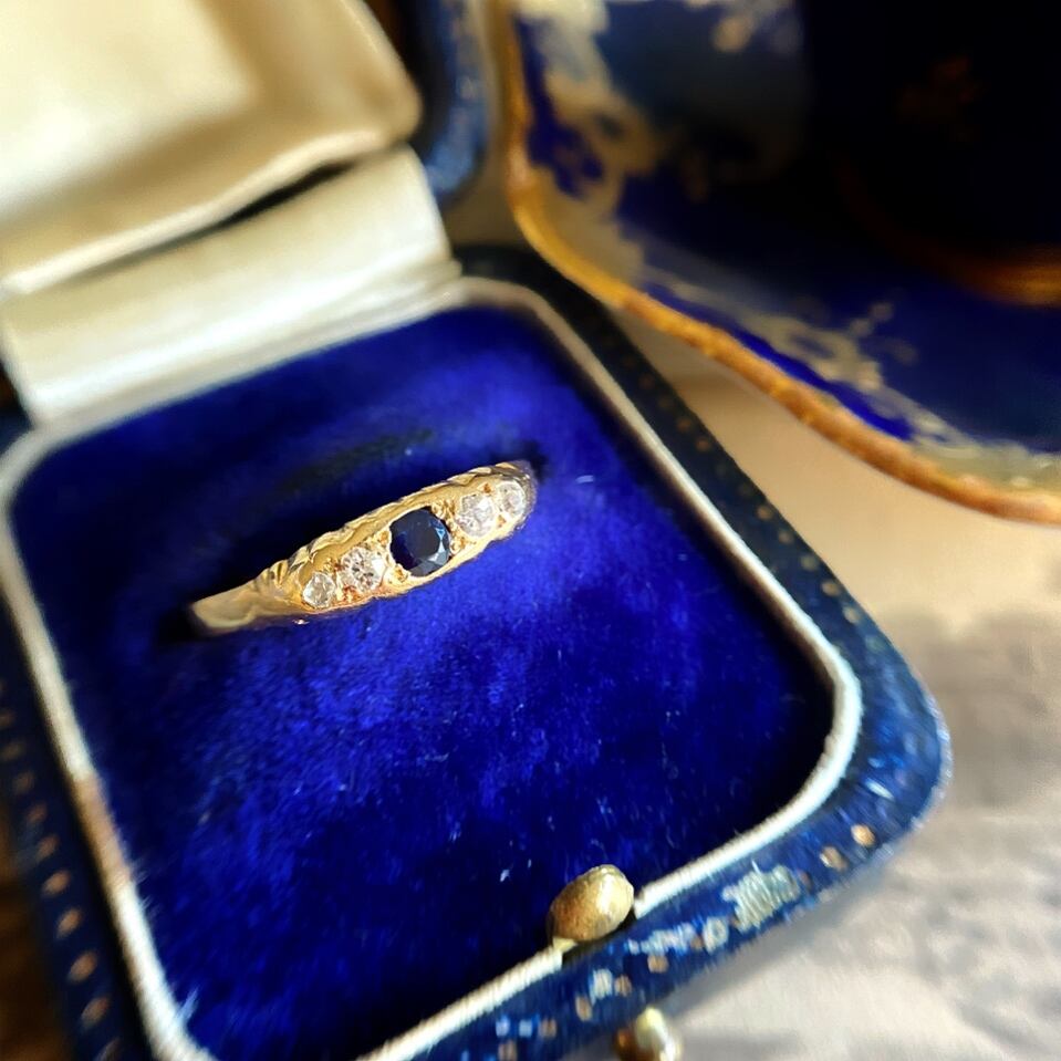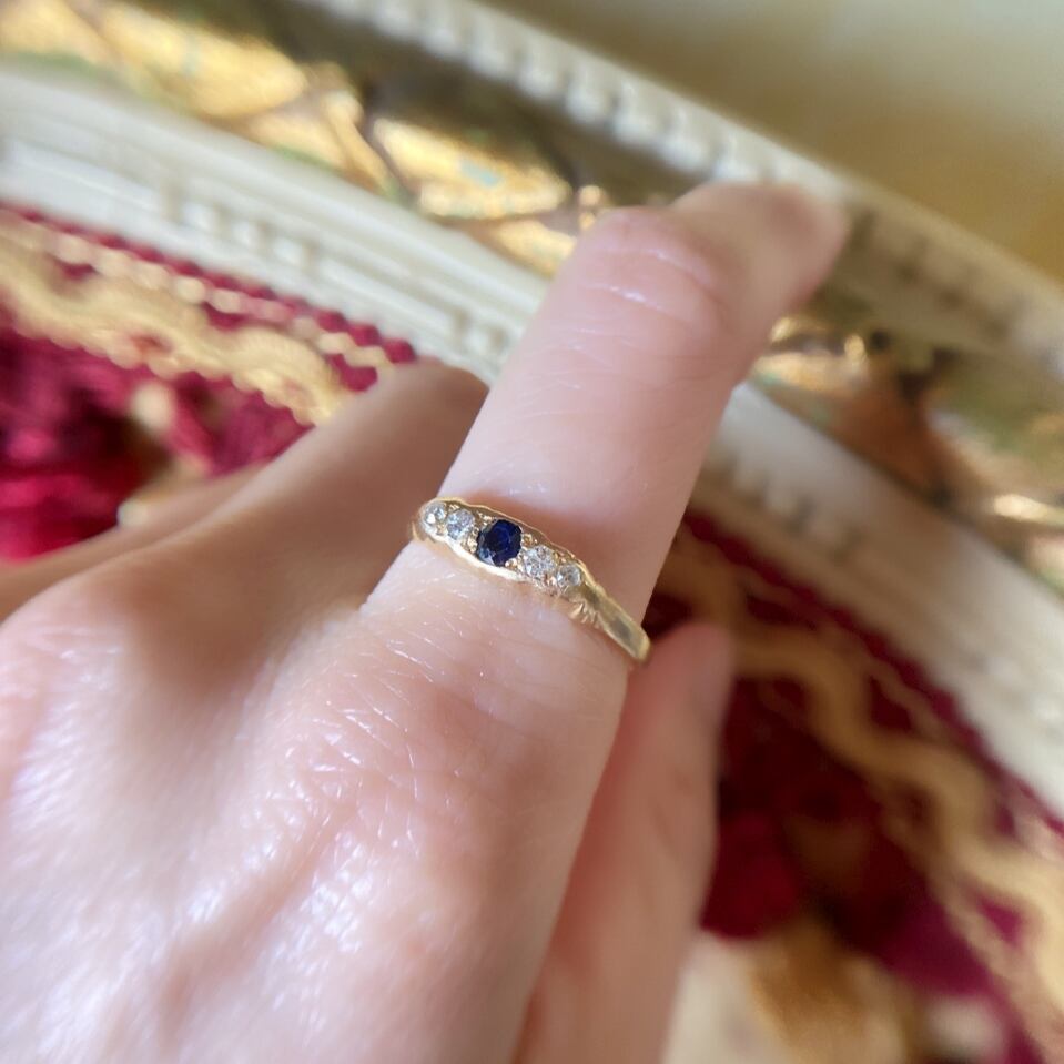 ほんの少し立ち上がった台座にセットされた黒に近い深いブルーサファイアを中心にして、小さな星屑のようなオールドカットダイヤモンドが両方に2石づつセットされたファイブストーンリング。