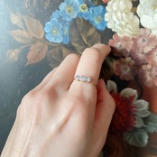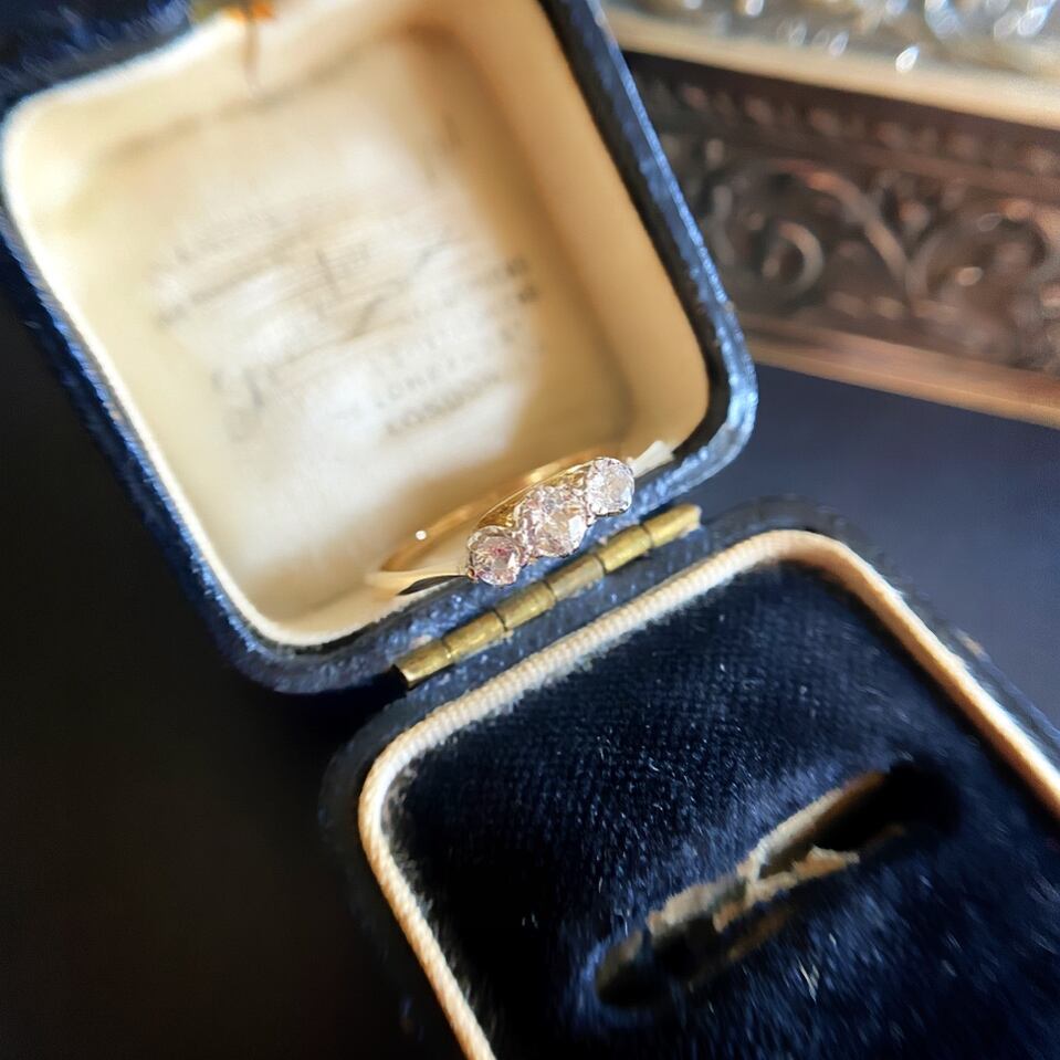 現代の整いきったブリリアントカットと違い、どこか整いきらないオールドヨーロピアンカットダイヤモンドの瑞々しい煌めきも柔らかで、ホッとする優しい輝きがたまらないトリロジーリング。