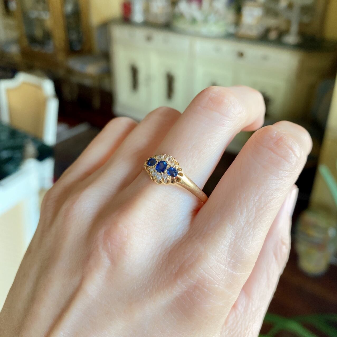 3石のクッションカットサファイアは中心が縦、サイドは横にセットされていて、18kイエローゴールドの滑らかなテクスチャーも美しく、エドワーディアンらしい貴族的な上品な雰囲気を感じるひと品です。