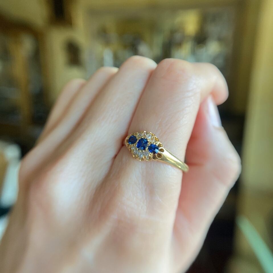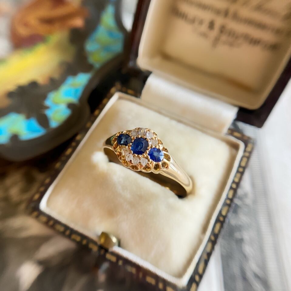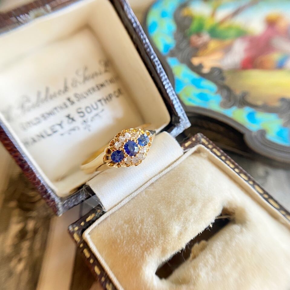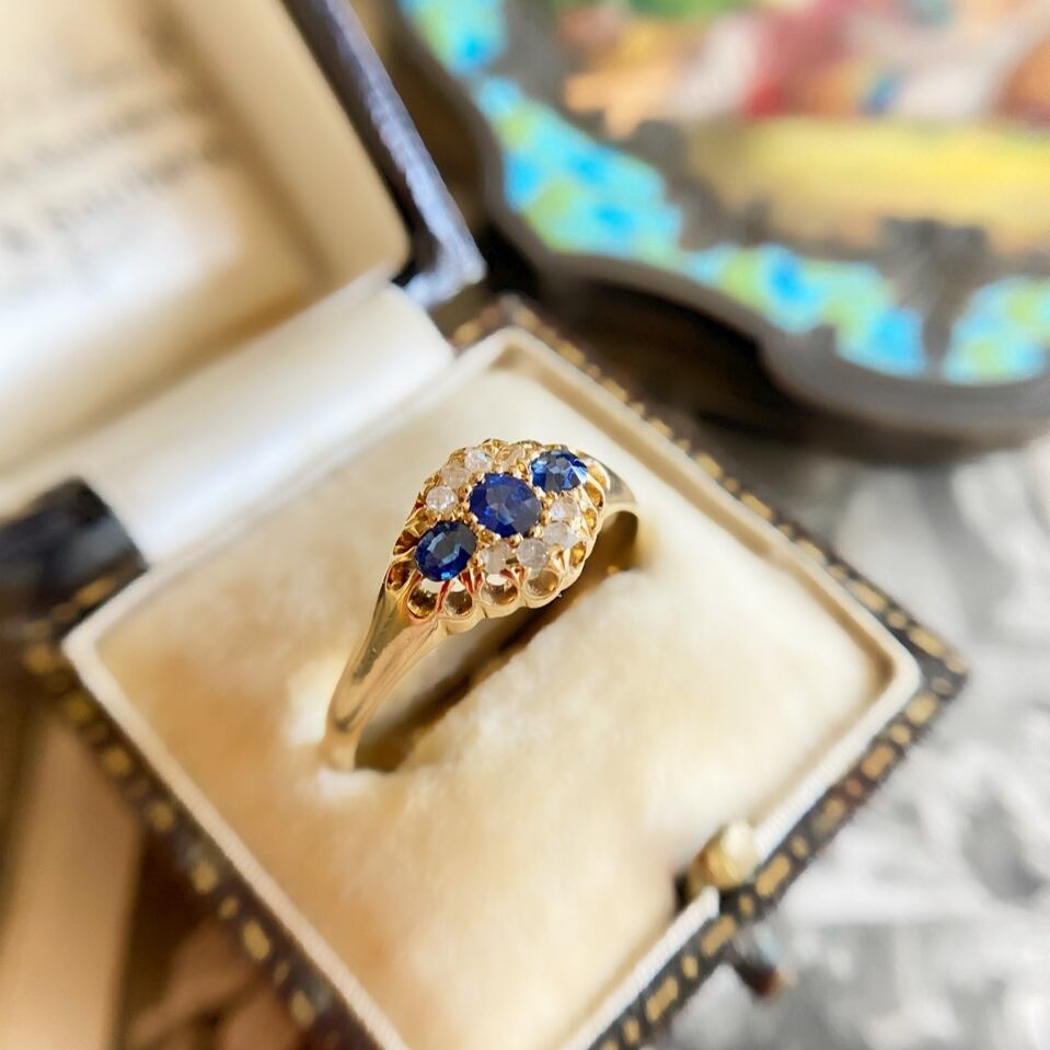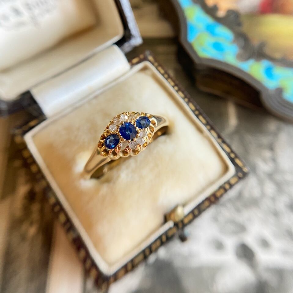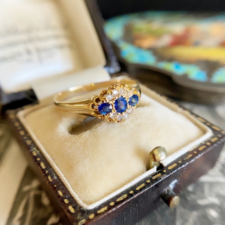 3石の色の深みや透明感が美しいブルーサファイアを囲うようにして上下に4粒づつの荒削りされた小さな小さなローズカットダイヤモンドを飾ってちょっぴり華やかなに仕立てたエドワーディアンリング。