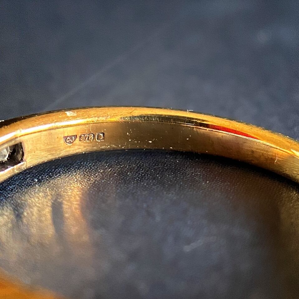 ダイヤモンドにはたくさんの細かいカットが施されているので、仕上がりがモザイクのような反射を作り出し、石が動いたときにキラキラとした他のカッティングにはない輝きを見られることが魅力の一つ、刻印がありますが、どちらの物か判別が出来ませんでしたが、仕入れ先は英国になります。