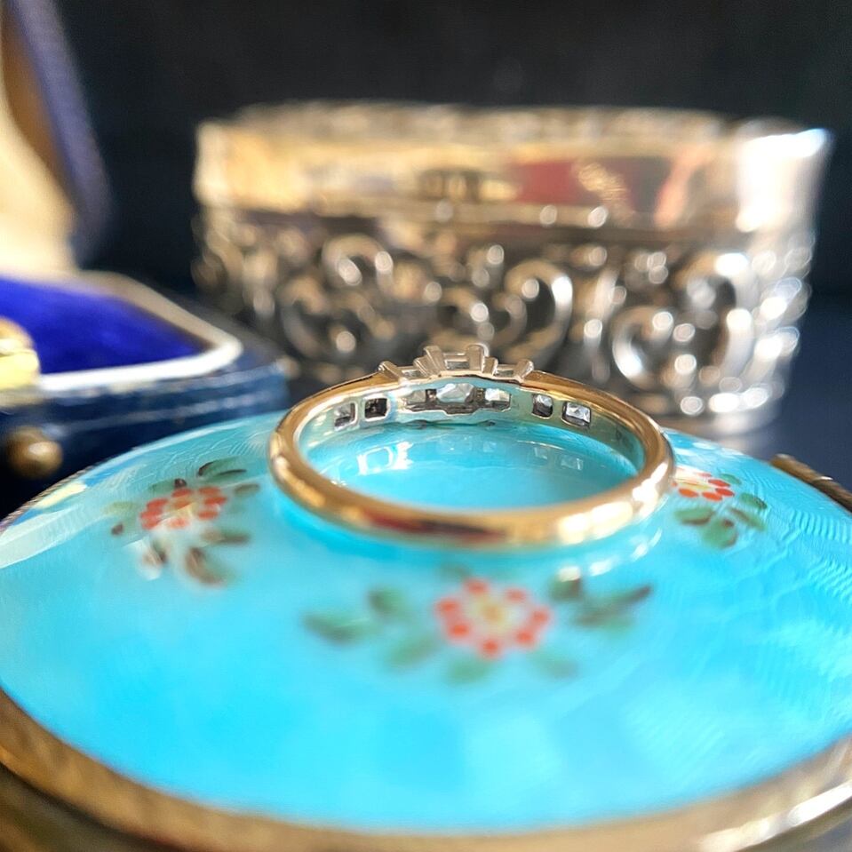 中心の3石は爪留め、ショルダーの3石はインビジブルセッティング(ミステリーセッティング)でピッシリとクールにセッティングされていて、2種類の違うセッティングを愉しめるのも嬉しいポイントですね。