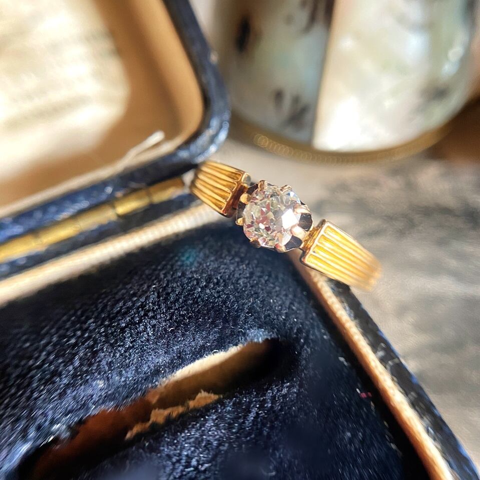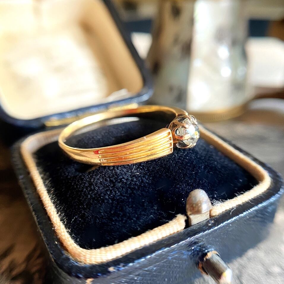 ゴールドの台座にセットされたオールドマインカットダイヤモンドのソリテールリング。