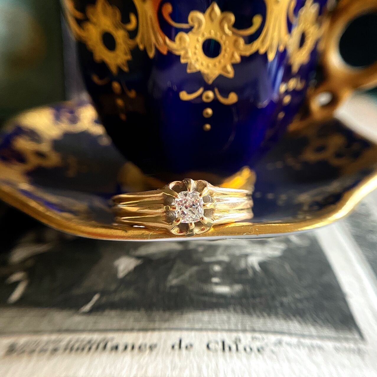 そんなデザインのリングに8つの爪でしっかりホールドされているダイヤモンドはオールドマインカットダイヤモンド。