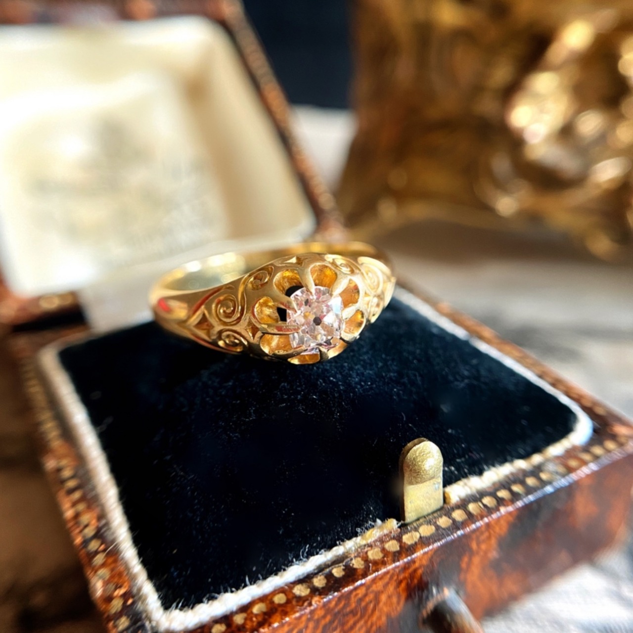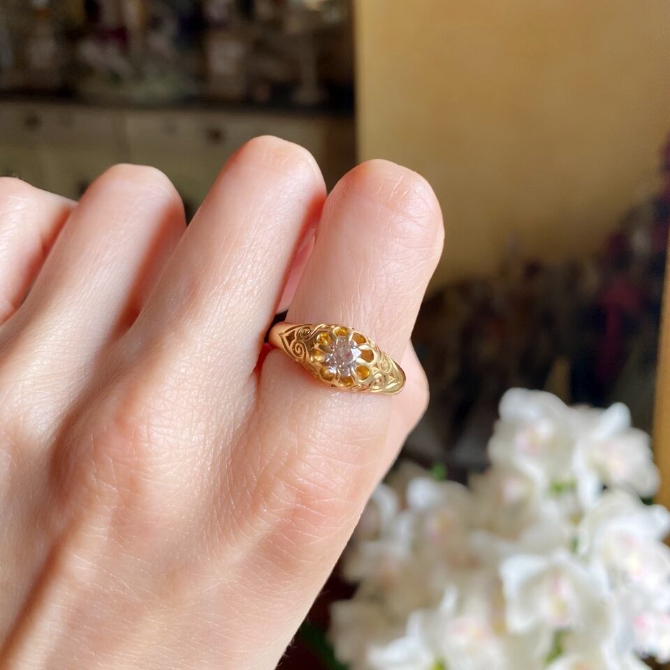 デコラティブで美しい彫金の先には朝露に光る滴のように輝くオールドマインカットダイヤモンドはまるで咲き誇ったばかりの春の花々のように生き生きとした瑞々しい姿を見せてくれる、どこから見ても美しいソリテールリングのご紹介です。