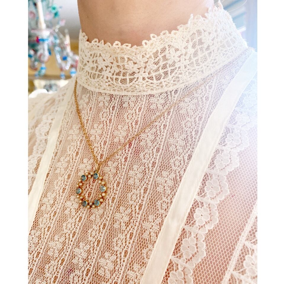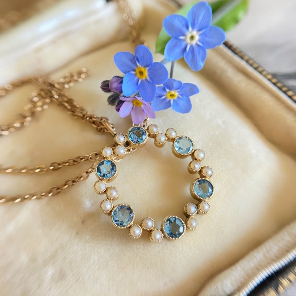 イエローゴールドの縁取りに彩られた、澄んだ輝きのアクアマリンとハーフパールの上品で清楚な輝きが胸元で揺れる飛び切り美しいエドワーディアンリースペンダントのご紹介です。