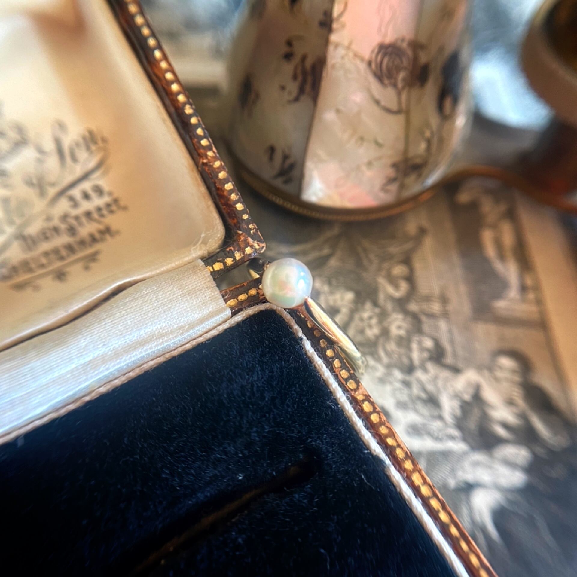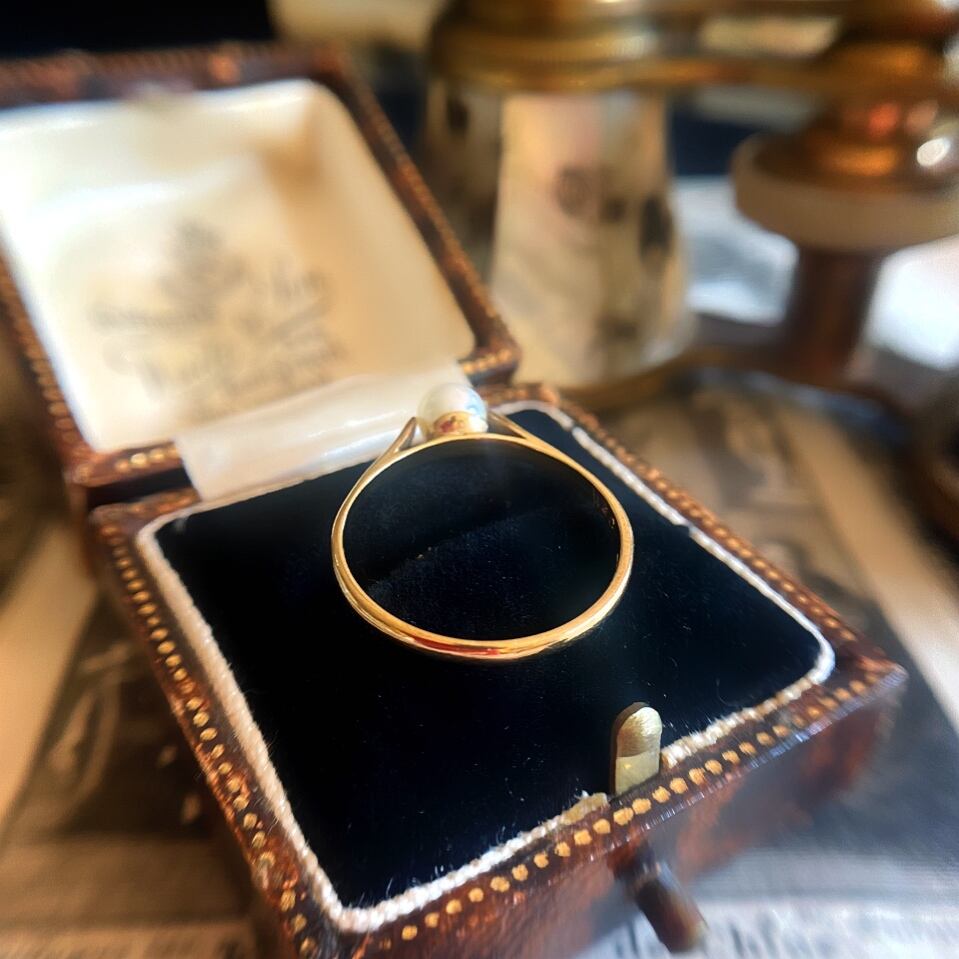 シンプルでほっそりとしたイエローゴールドのシャンクにぽっかりと浮かぶお月様の様に、丸々と艶やかなつぶらなパールが一粒佇む、可愛らしいヴィンテージリングのご紹介です。