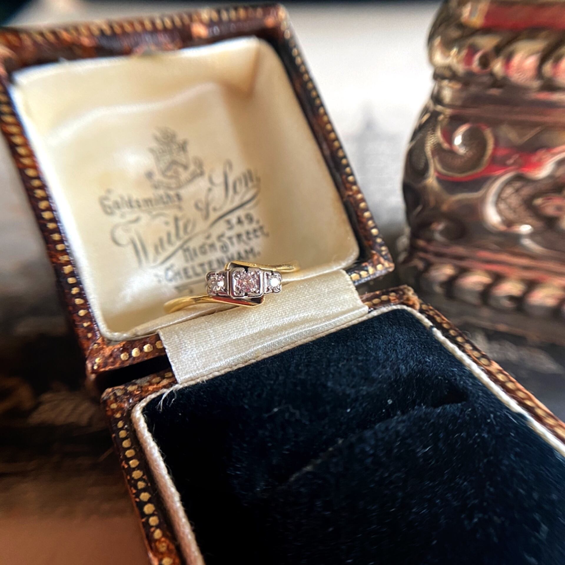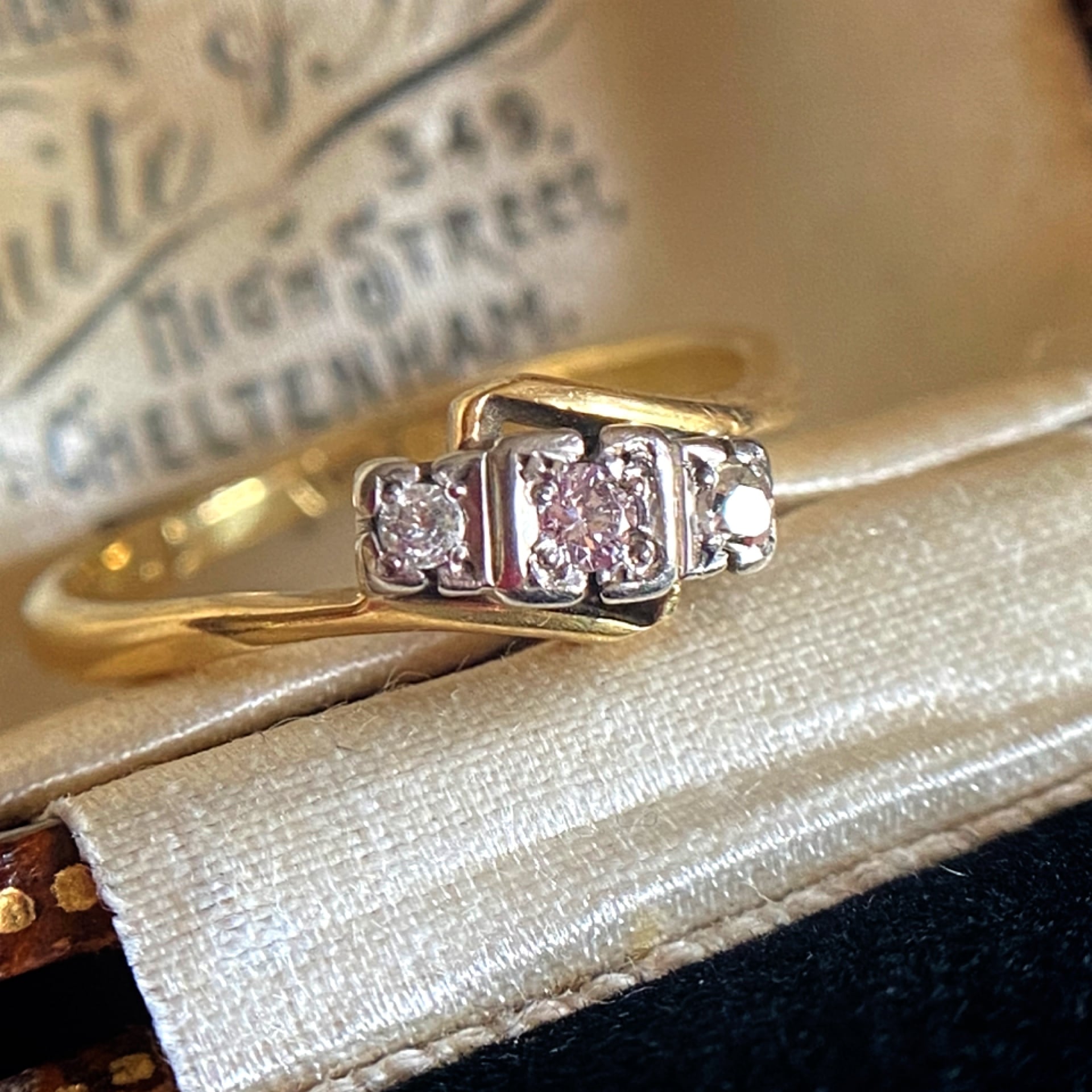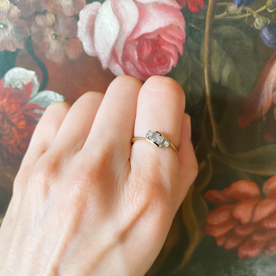 細いゴールドのアームに包まれるようにして星屑のような小さなダイヤモンドが並んだスリーストーンリングのご紹介です。
