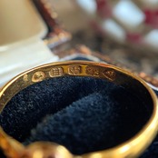 アンティークジュエリーは通常ホールマークは残っていない物も多かったり、読み取りにくかったり、一部だけ残っていたりと、なかなか完璧に残っている物は意外にも少ないのが現実。しかしこちらは、ヴィクトリア女王の横顔のDuty markまでも綺麗に残っていて、内側のホールマークを眺めて見ているだけでも気分がウキウキとしてしまうリングなのです。