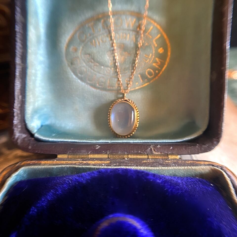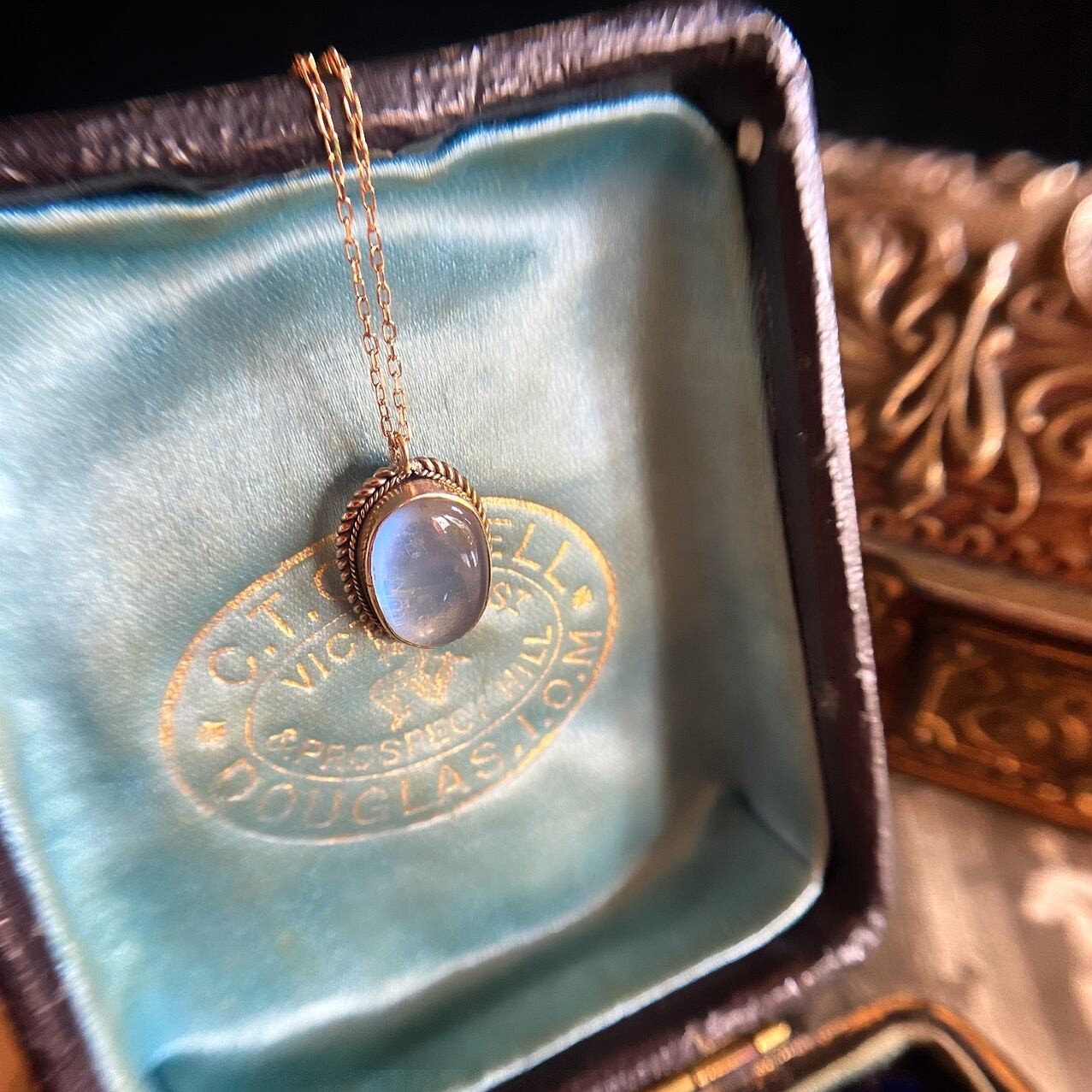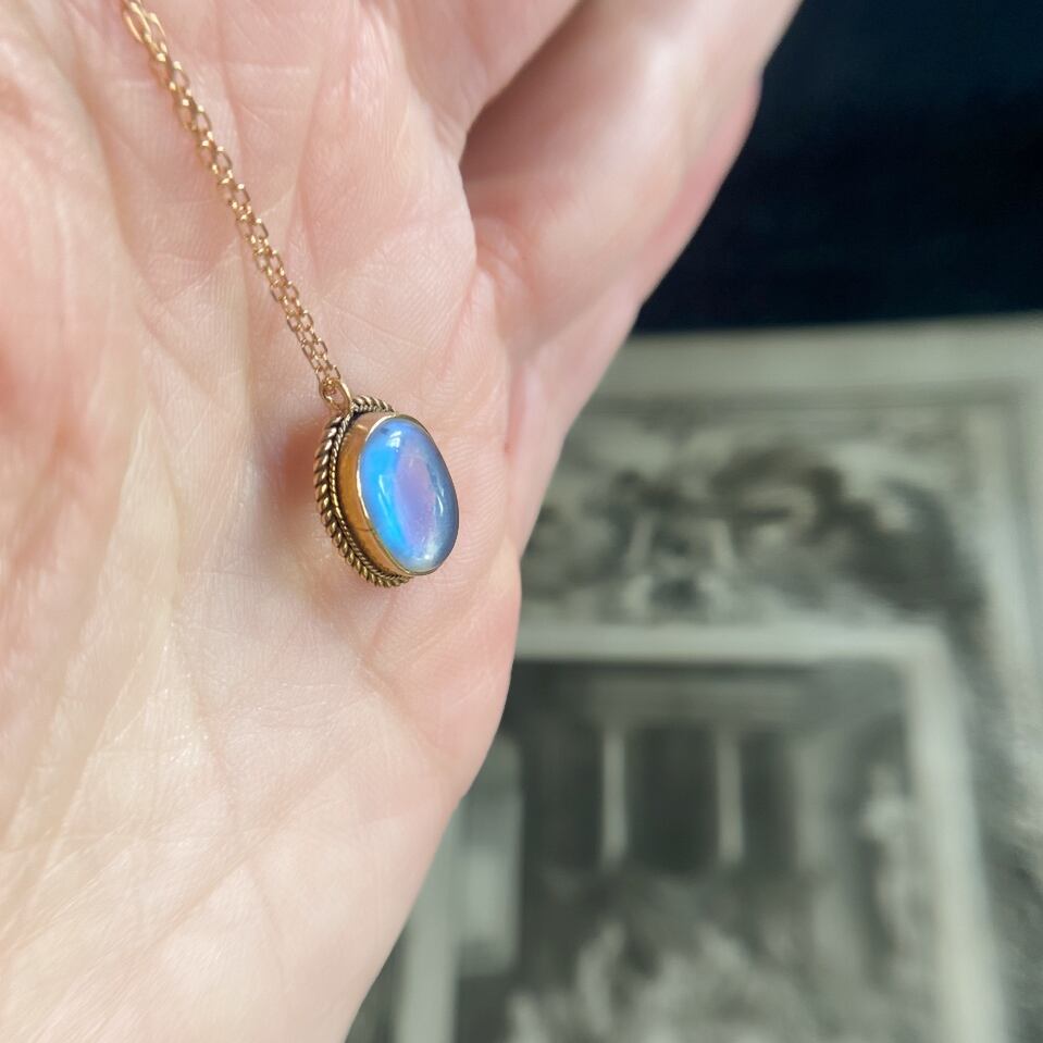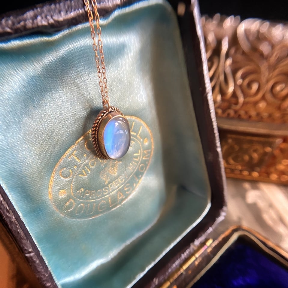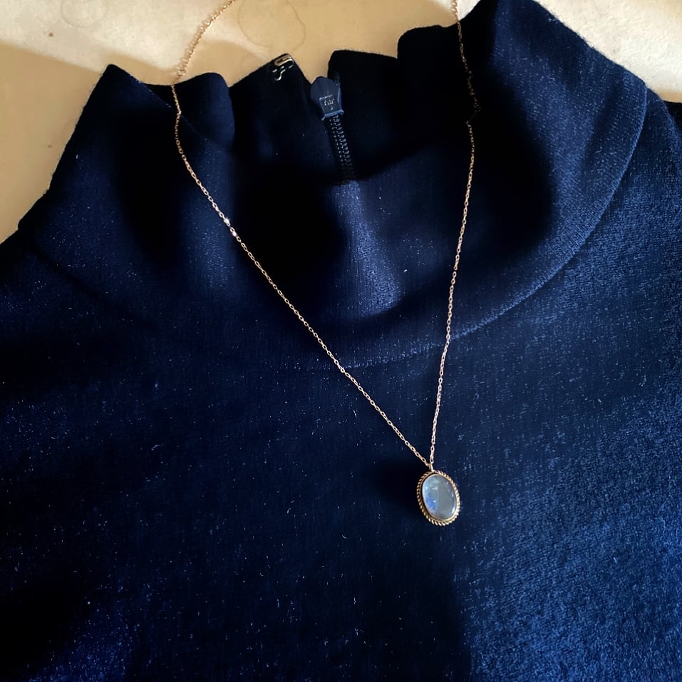 あえてチェーンは細い物にし、あくまでもペンダントだけに視線があつまるように致しました。肌に乗せるとムーンストーンが浮き立ち美しいです。