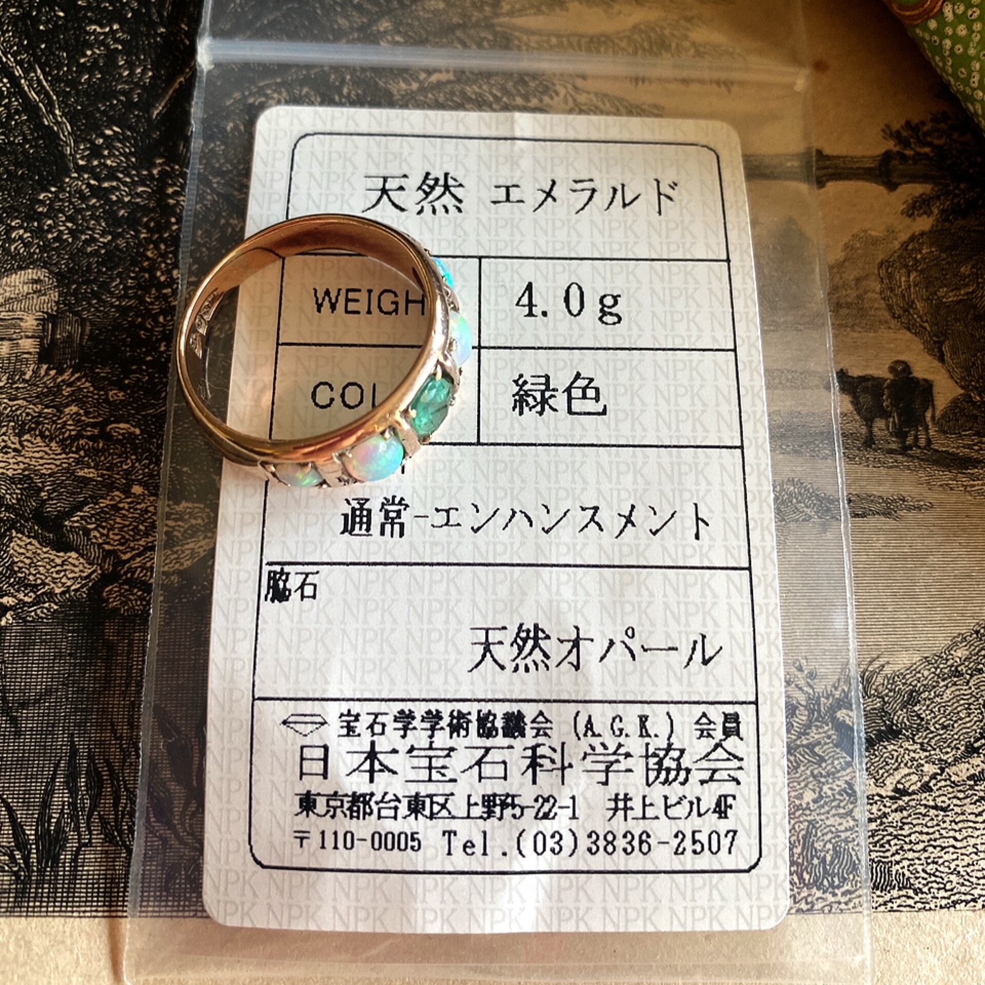 中心のエメラルドも所謂理想的なエメラルドの色ではありませんが、こちらのオパールと合わせるためにセレクトされたであろう、その意図がわかるくらい、こちらのリングでしっとりとした役割を果たしてくれています。