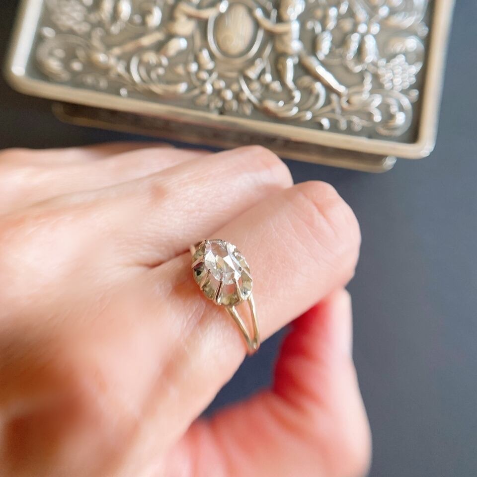 まるで氷を宝石にしたかのような透明度と輝きが魅力的なフルローズカットダイヤモンドのソリテールリング。