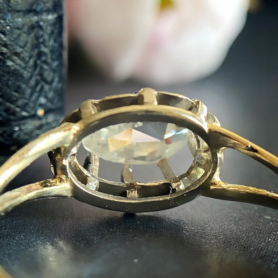 こちらのダイヤモンド、通常ローズカットダイヤモンドは裏が平面になっているのですが、こちらは裏にもローズカッティングが極極薄く、肉眼ではわかりずらく、平面にしかみえませんが、角度を変えないとわからない程度に僅かなカットが施されているのです!!見えない所までにもさりげない美しさを求めたその"美"へのこだわりにため息しかありません。