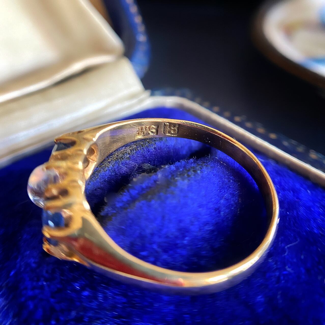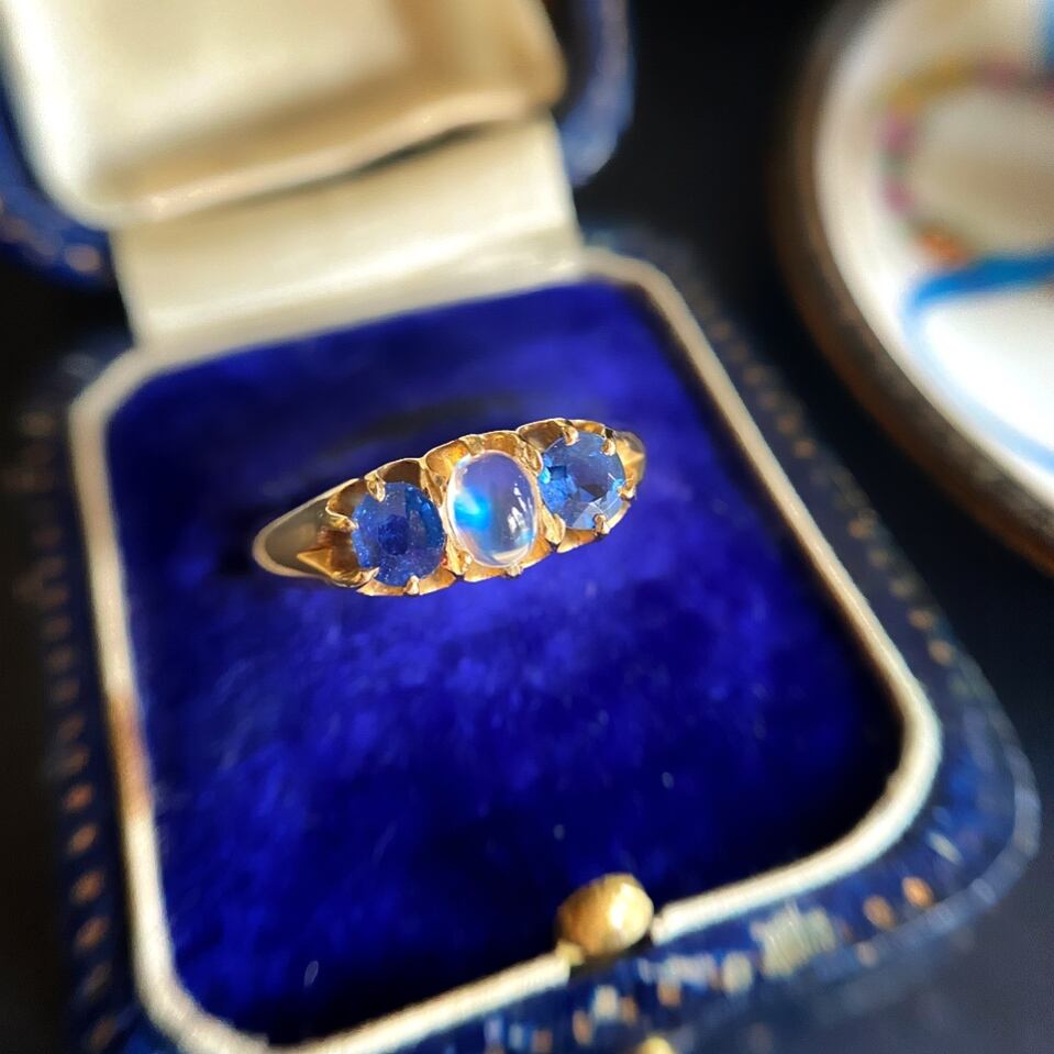 ムーンストーン&ブルーサファイアスリーストーンヴィクトリアンリンリング