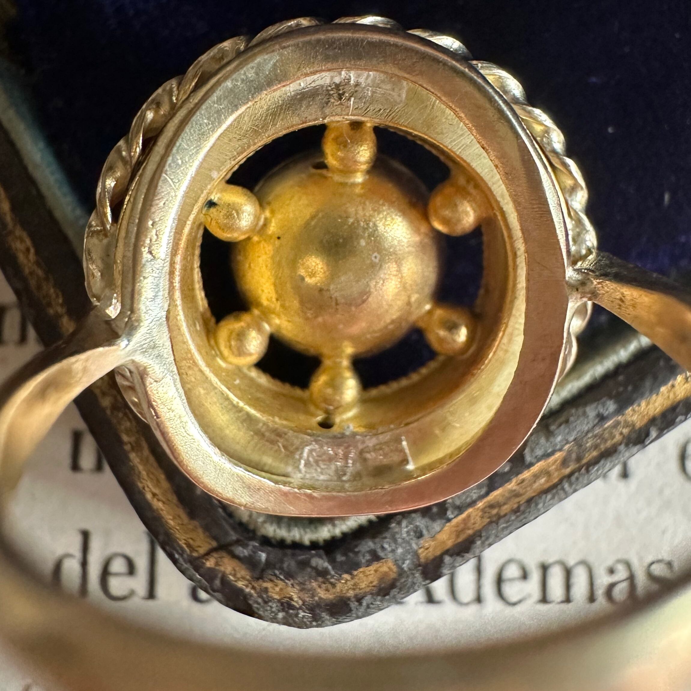 1870年頃にイタリアで発見された遺跡から出土した古代の金細工の美しさに感銘をうけたジュエリー作家がそれを再現しようと、インスピレーションを受け誕生したスタイルのジュエリーをエトルスカンリバイバルといい、あらたにヴィクトリアンスタイルとして定着したこちらのリング。19世紀後半のヨーロッパでは、上流階級の間で考古学風のジュエリーが流行したのでした。