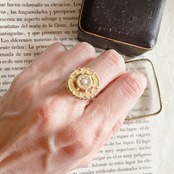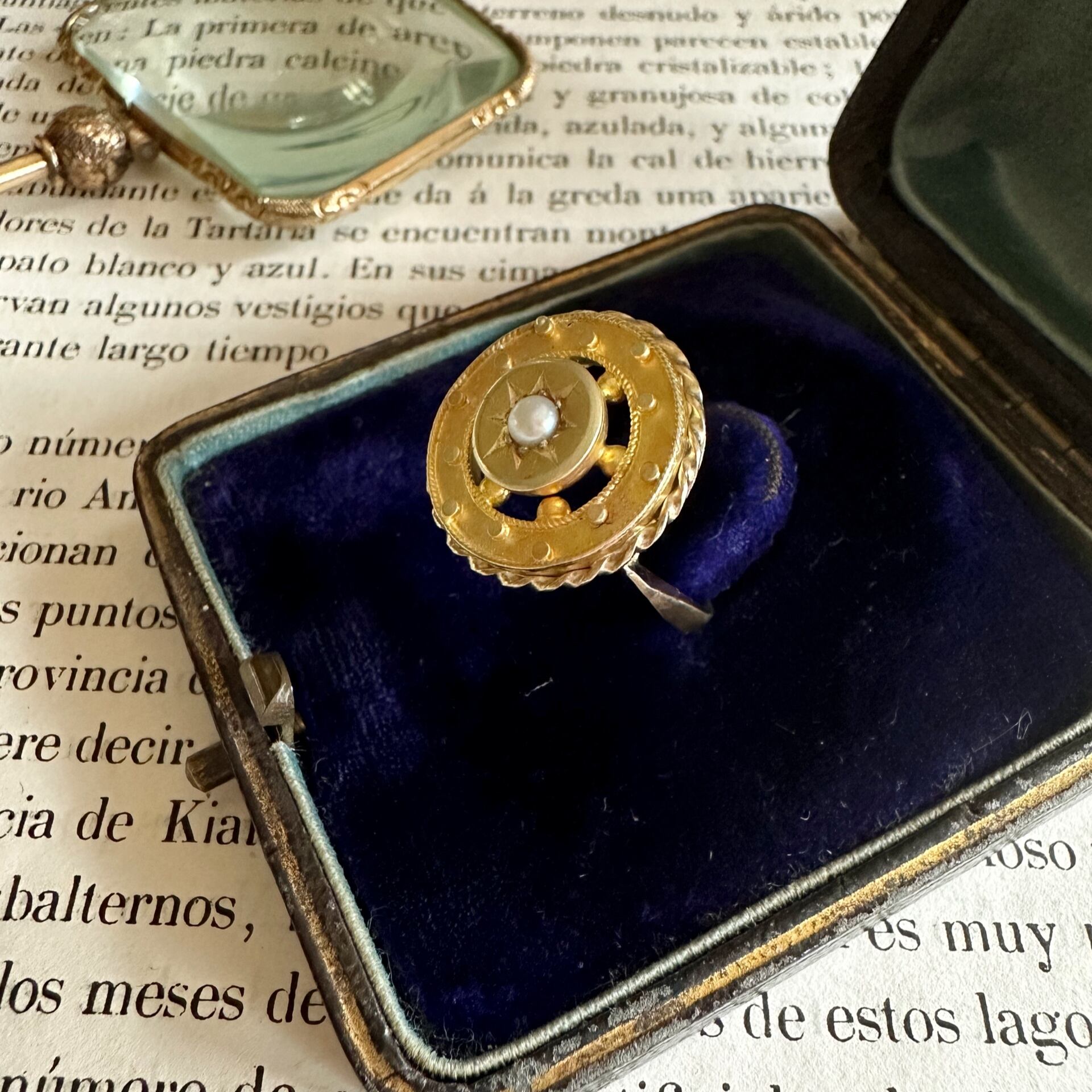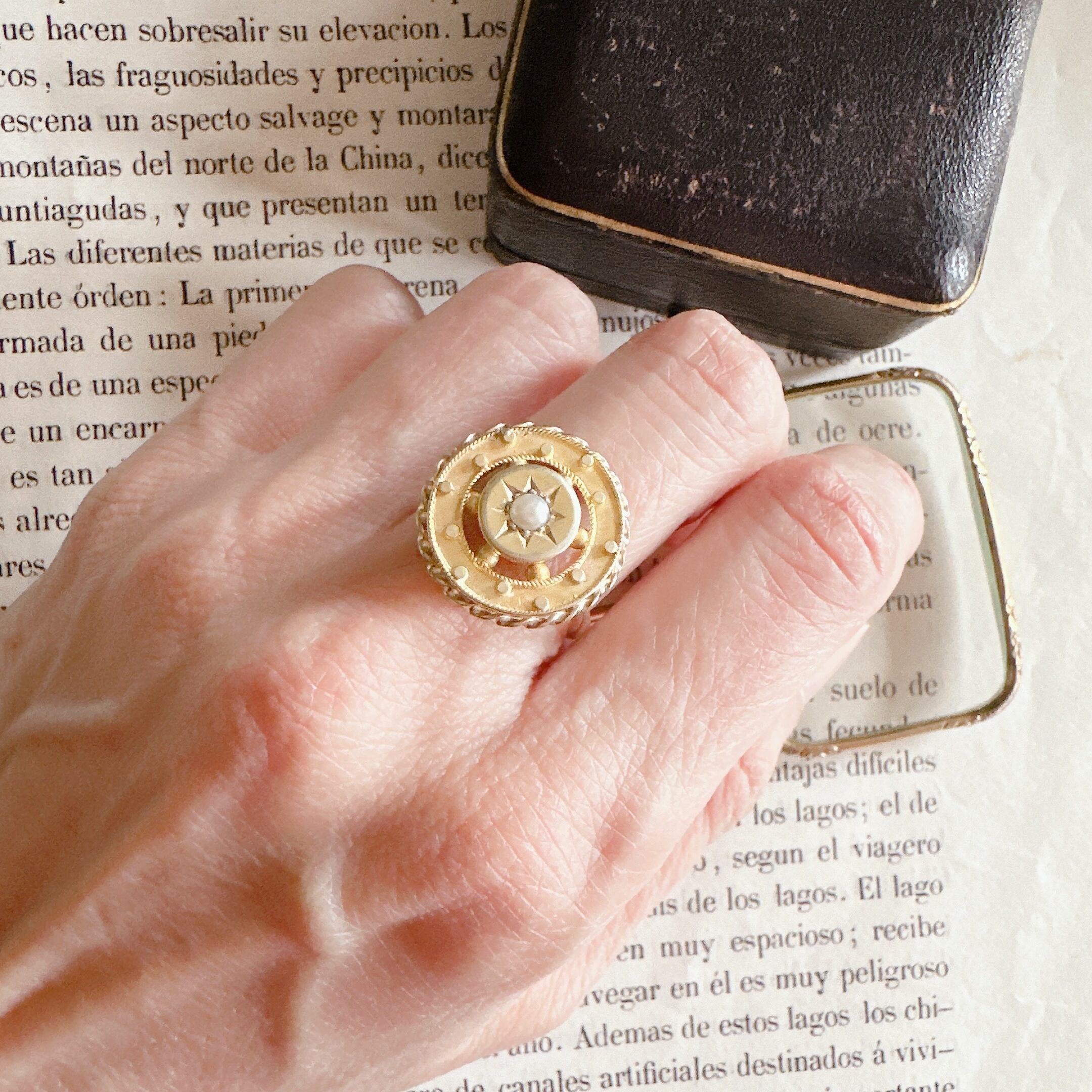 美しい金細工の中心に小さなハーフパールがひっそりと佇み、ゴールド一色の中でシルキーなクリーム色はたとえ小さくともあるのと無いのでリングの印象も違った事でしょう。ゴールドの煌めきの中で上品な静けさを演出してくれているように感じます。